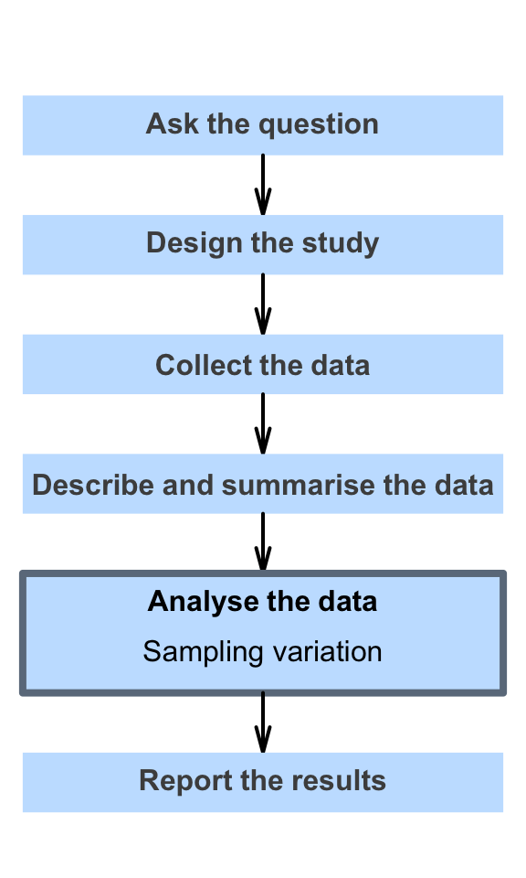 So far, you have learnt to ask a RQ, identify different ways of obtaining data, design the study, collect the data describe the data, summarise data graphically and numerically, and understand the decision-making process.