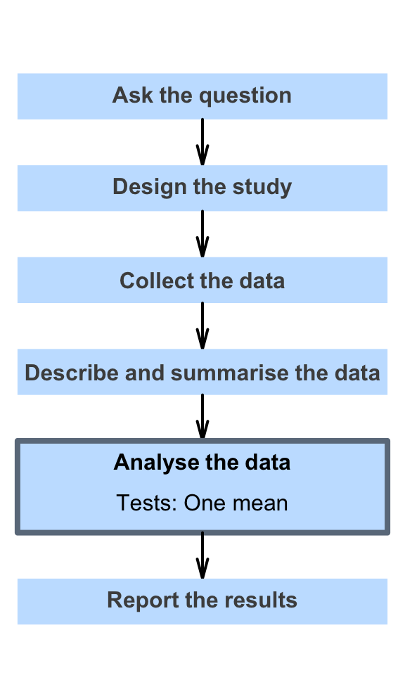 - conduct hypothesis tests for one sample mean, using a \(t\)-test.