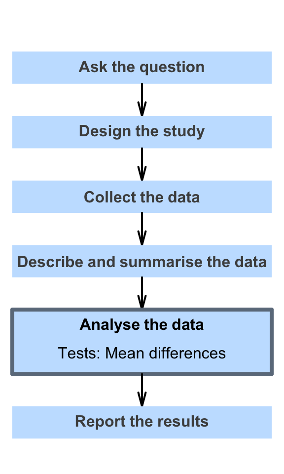 So far, you have learnt to ask a RQ, identify different ways of obtaining data, design the study, collect the data describe the data, summarise data graphically and numerically, understand the tools of inference, and to form confidence intervals.