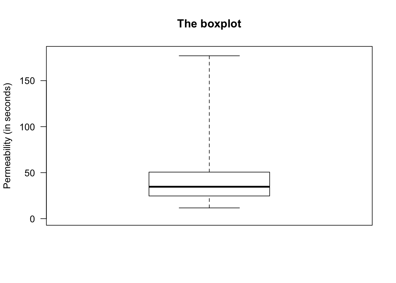 Measurements of permeability time (the time for water to permeate the sheets) were taken from 81 pieces of material (in seconds). For these data \(Q_1 = 24.7\) and \(Q_3 = 50.6\), so we find that \(\text{IQR} = {50.6 - 24.7 = 25.9}\). Then, extreme outliers observations are \(3\times 25.9 = 77.7\) more unusual than \(Q_1\) or \(Q_3\). That is, extreme outliers are observations: