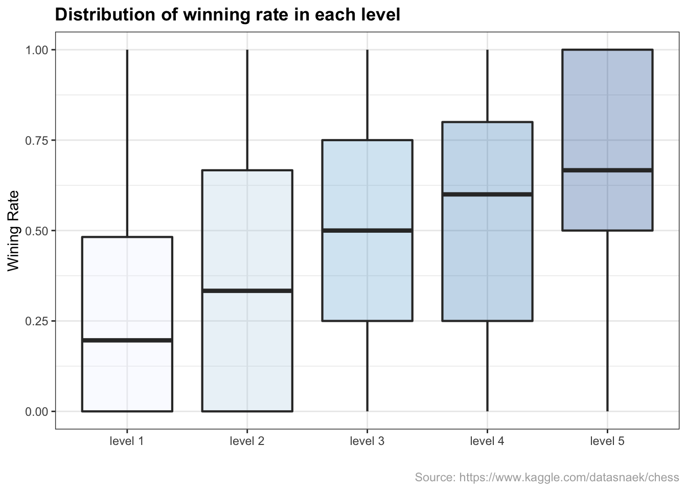 Among 5 levels, players placed in level 1 had the average lowest win rates compared to other players. As ratings went up, the average win rate within each level went up as well. At level 1, the average win rate was around 23% while at level 5, where most players had strong chess skills, had average win rate around 65%. Few players has win rates of 100% and 0 % and that is because they play only one game which was won or loss and did not play any longer.
