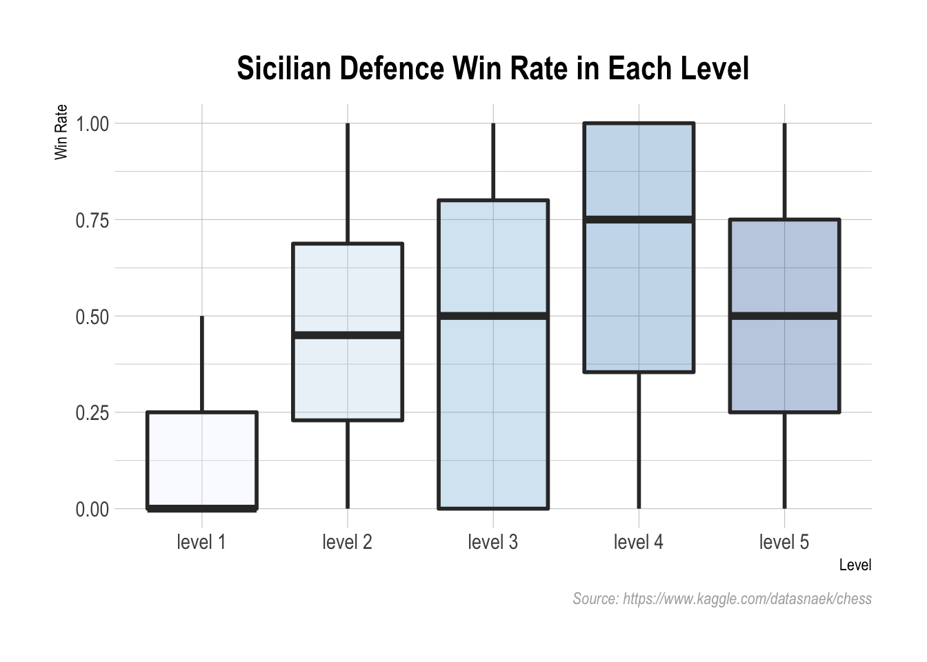 Above two graphs displayed players’ winning probabilities who implemented Sicilian Defense in each level. Apparently, players in level 4 used Sicilian Defense had the highest average win rate (75%) while level 1 players had the lowest win rate (0%). For level 3 players, the effectiveness of the Sicilian Defense varied greatly. Its average win rate was approximately 50% which was average compared to win rates in other levels, but it had the largest variance as well. Some players played the Sicilian Defense and achieved win rates around 78% and some players used the same strategy but never won.