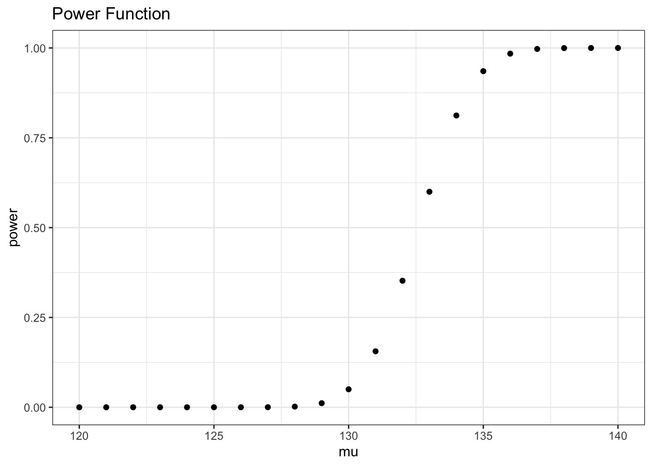 Our intuitions were correct here; power increases with \(\mu\). It begins to increase around 130 and hits essentially 100 around 135; this means that, if the true mean is 135 or higher, we have a very high probability (near 1) of observing a sample mean within the rejection region (over 132.6).
