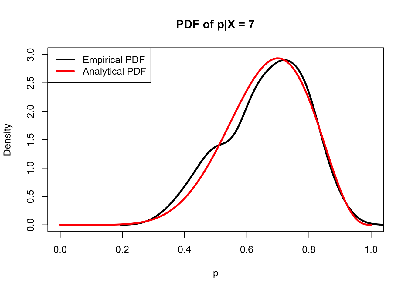 We can check this result with a simulation in R, where we generate \(p\) from the prior distribution and then generate \(X\) conditioned on this specific value of \(p\). We should see that, conditioned on \(X\) being some value, the density of \(p\) matches the analytical density we just solved for (that is, it has a Beta distribution with the above parameters).