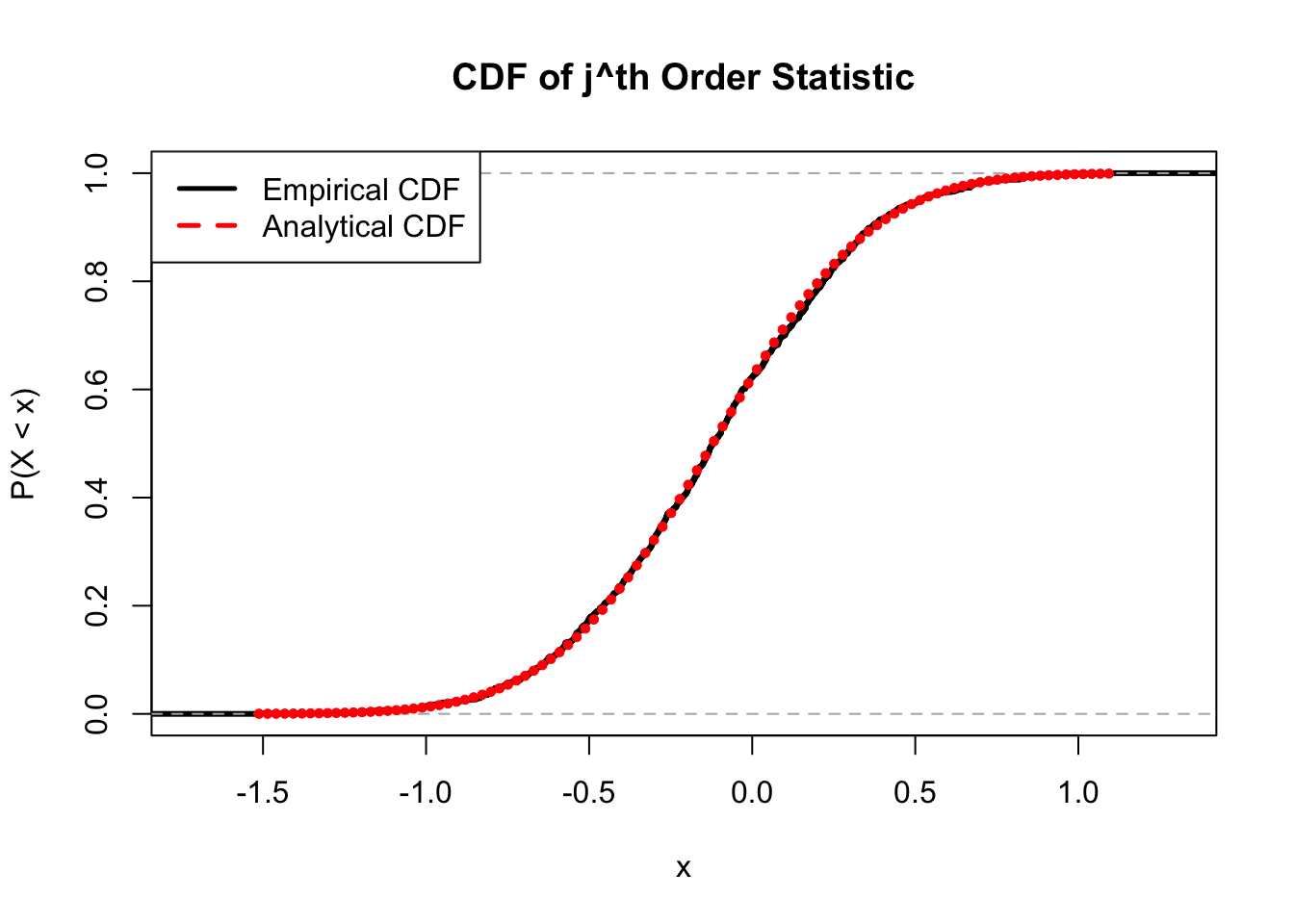 We can confirm our CDF result with a simulation in R. For simplicity, we will define the \(X\) random variables as Standard Normal; we then empirically find the \(j^{th}\) order statistic from \(n\) draws, and compare the empirical CDF to the analytical one that we solved above.
