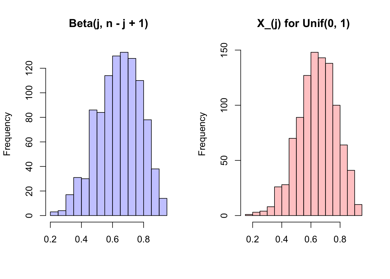 We mentioned above that \(X_1, X_2,...,X_n\) can be any random variables (dependent, different distributions, etc.), but for our purposes we will consider i.i.d., continuous random variables. There are a couple of reasons for this simplification. First, i.i.d. is simply an easier case to deal with than random variables that are dependent or have different distributions. Second, discrete random variables have probabilities of ties when we try to order them. That is, if we have that \(X_1, X_2\) are i.i.d. \(Bern(1/2)\) and both \(X_1, X_2\) crystallize to 1, we have a ‘tie’ (the random variables took on the same value) and determining the order statistics is trickier (which one is the max? which is the min?). Recall that continuous random variables have probability 0 of taking on any one specific value, so the probability of a tie (i.e., one random variable taking on the value that another random variable took on) is 0.