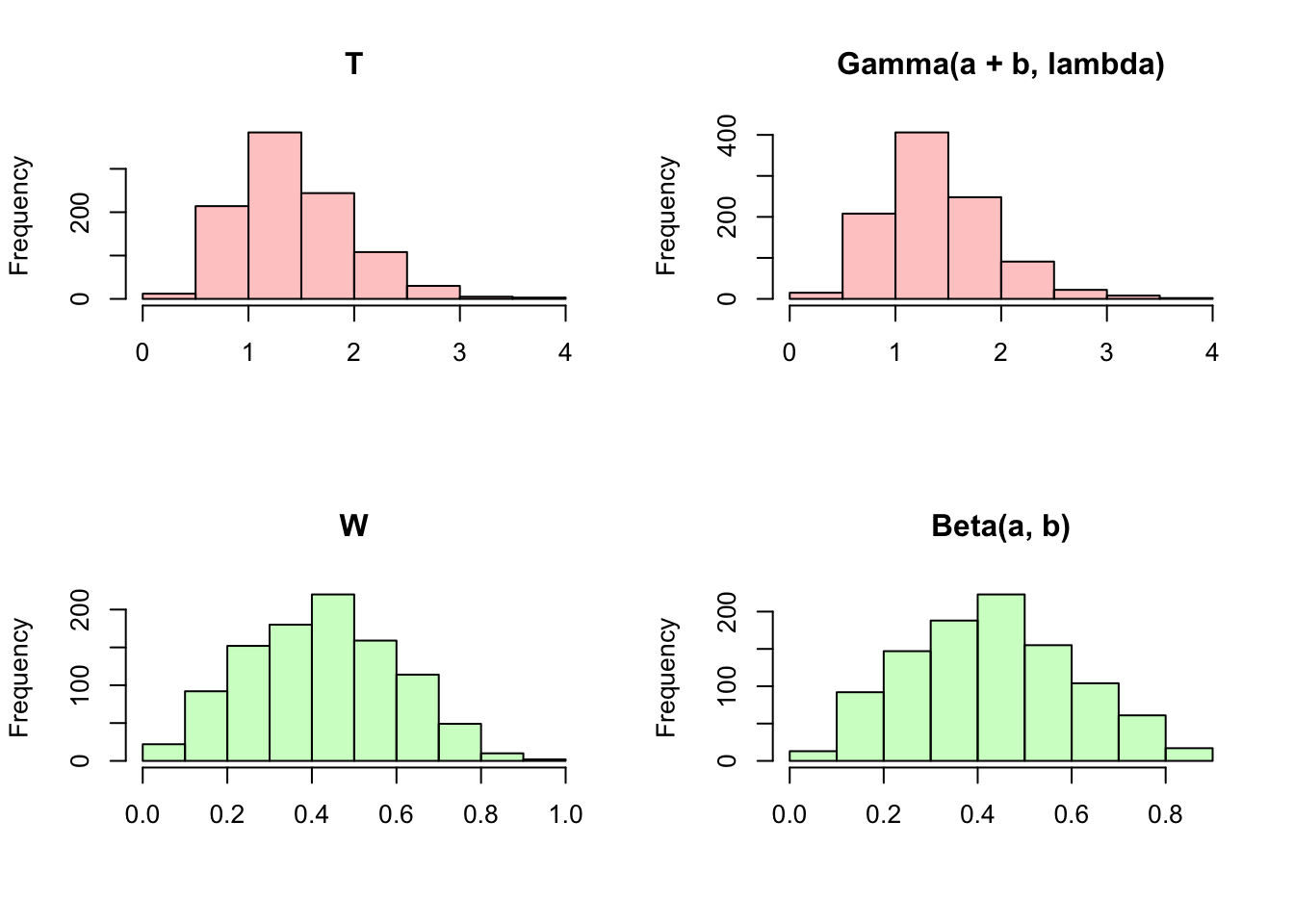 Now let \(X \sim Gamma(a,\lambda)\) and \(Y \sim Gamma(b,\lambda)\). Show without using calculus that \[E\left(\frac{X^c}{(X+Y)^c}\right) = \frac{E(X^c)}{E((X+Y)^c)}\] for every real \(c>0\).