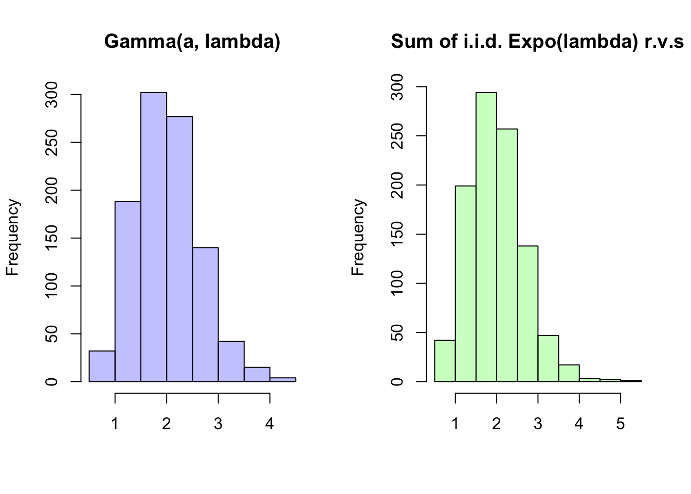 Let \(X \sim Gamma(a,\lambda)\) and \(Y \sim Gamma(b,\lambda)\) be independent, with \(a\) and \(b\) integers. Show that \(X+Y \sim Gamma(a+b,\lambda)\) in three ways: (a) with a convolution integral; (b) with MGFs; (c) with a story proof.