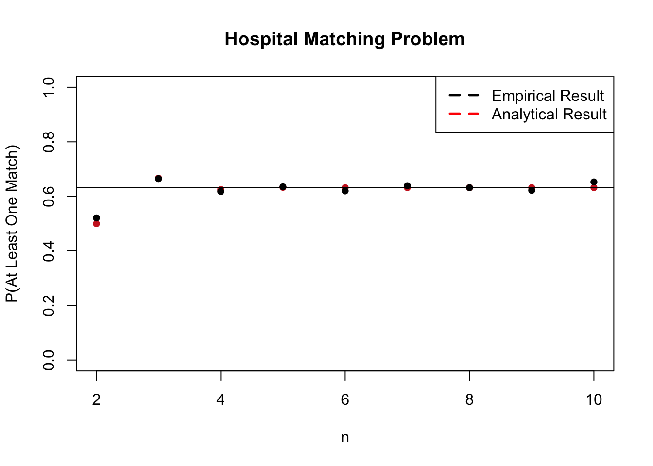 Now consider an example that is very similar in structure to ‘de Montmort’s matching problem,’ a classic example fully discussed here by Professor Joe Blitzstein. There are \(n\) couples at the hospital, and each has 1 baby (for a total of \(n\) babies). All of the couples leave their babies in the hospital and go home to rest, and come back in the morning to pick up their babies. However, there is a horrible mix-up in the nursery, and each couple is simply given a random baby. Let \(A\) be the probability that at least one couple gets their baby back. Find \(P(A)\).