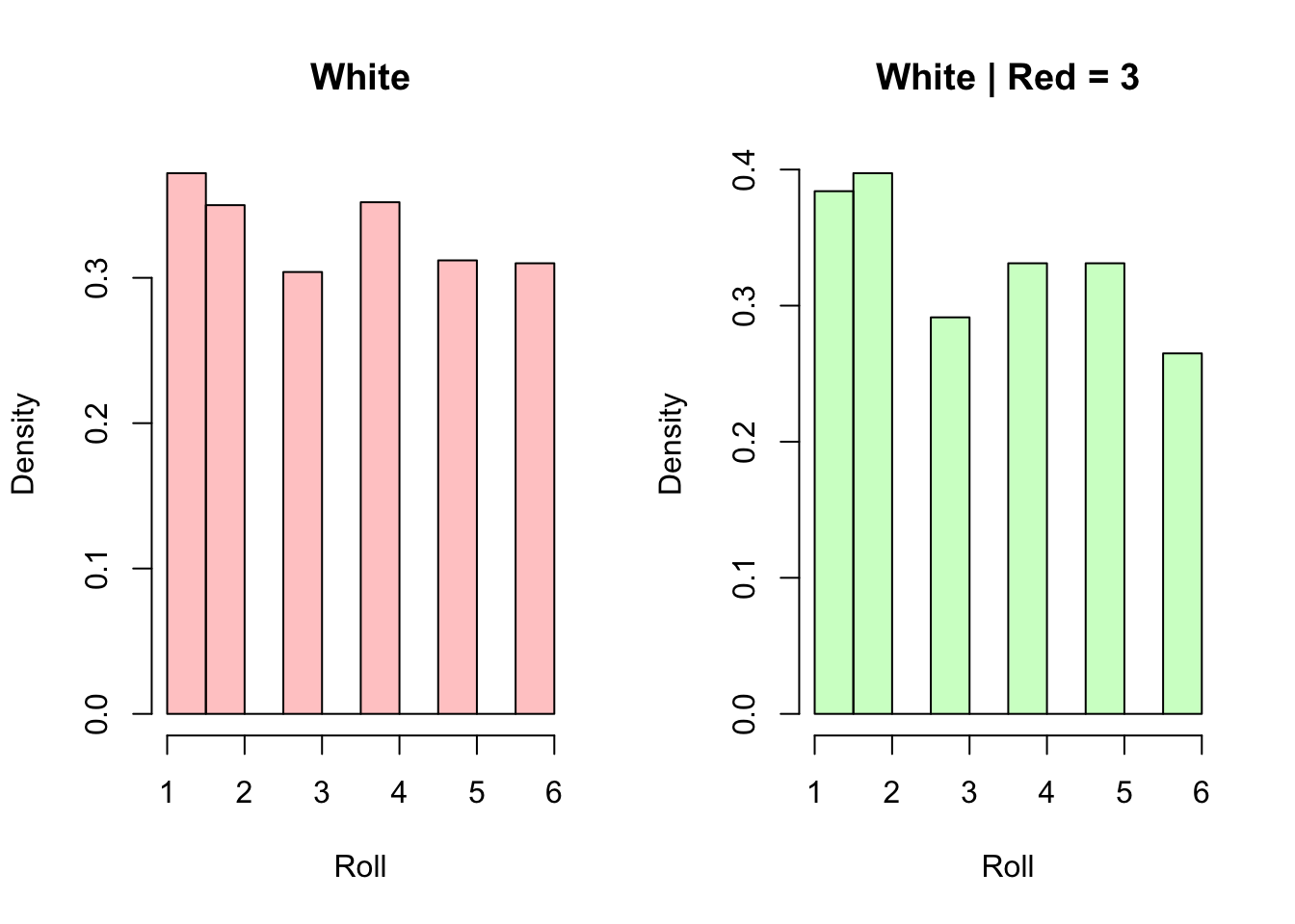 We can confirm our intuition with a simulation in R. We will create vectors that we will fill with 0 or 1 (based on the outcome of a random simulation that tells us if the above events occur); 0 means that the event didn’t occur, 1 means that it did. This ‘binary’ vector is a useful convention, since we only have to take the mean of the vector to find the empirical probability of the event (i.e., if a vector has half 1’s and half 0’s, then the mean is 1/2, correctly implying that the event occurred 50% of the time). Recall that we can use runif(1) to generate a random number between 0 and 1; this allows us to simulate the above events (i.e., if runif(1) spits out a value less than .6, we say it is a sunny day, and if it spits out a value greater than .4, we say it is a rainy day). We will discuss more about what runif, or ‘generating a random value from a Uniform distribution,’ actually means in Chapter 4.