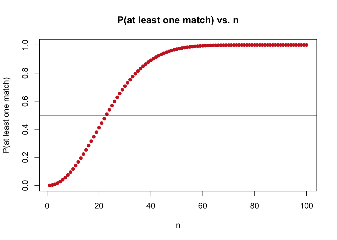 This is a very interesting problem with many applications: in later chapters, we will discuss how to find how many couples get their baby back on average (the Expectation, as we will then define it). It’s not immediately obvious why this is any different from the birthday problem (which we will see below): we are just sampling babies instead of days, and we are still looking for the probability of a ‘match.’ However, consider that we are now sampling without replacement (once you give a baby out, the baby is gone) as opposed to sampling with replacement in the birthday problem (there can be as many birthdays on a single day as you like; i.e., that day can be ‘sampled’ over and over again). Also, the ‘matches’ here are fundamentally different: we need the correct couple to pick the correct baby, not for multiple people to be born on an arbitrary day (these comparisons will make more sense when you refer to the ‘birthday problem’ section later in this chapter).