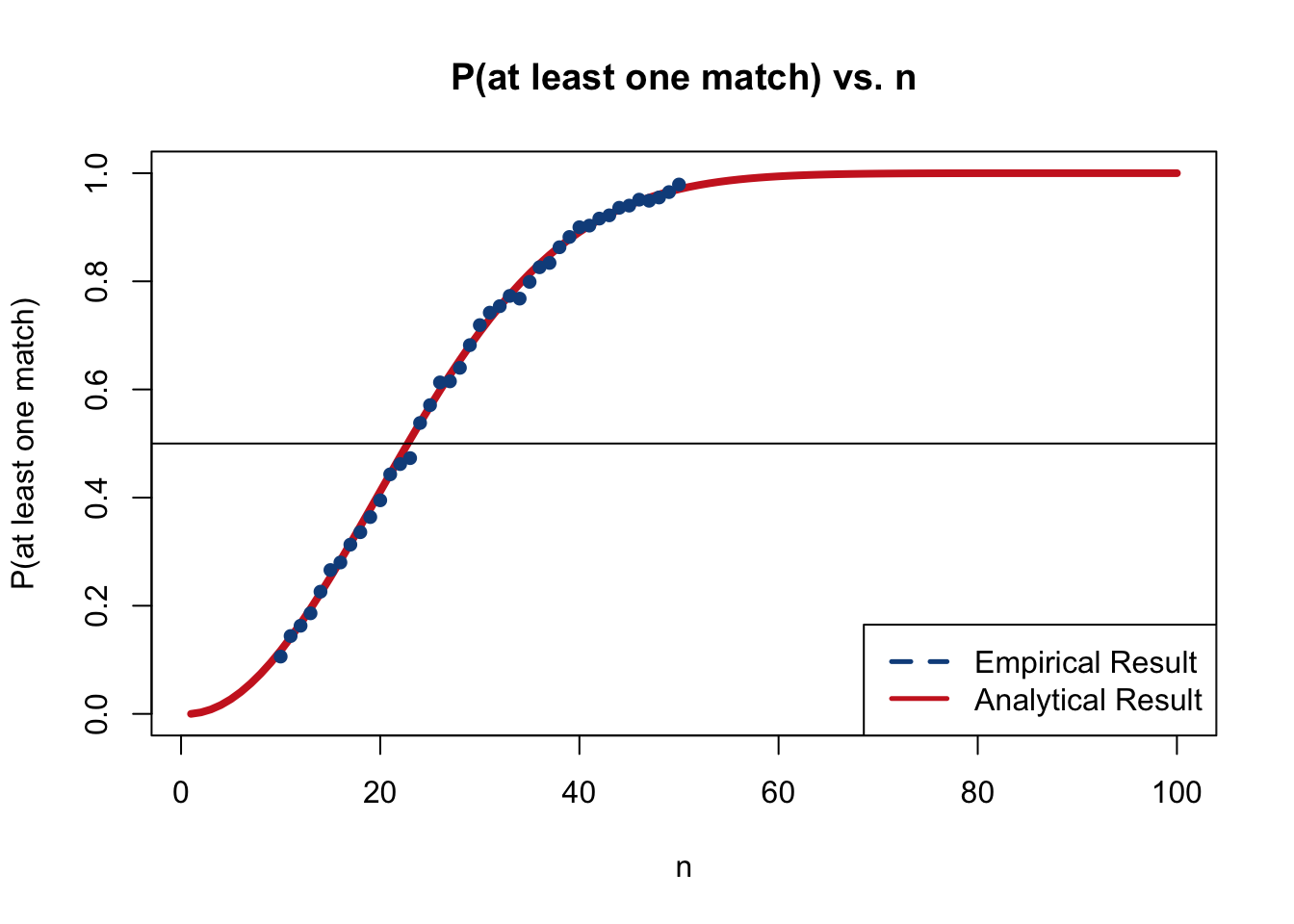 We can confirm our intuition with a simulation in R. As before, we will fill vectors with 0 or 1 to indicate if the events in question occurred or didn’t occur, respectively.