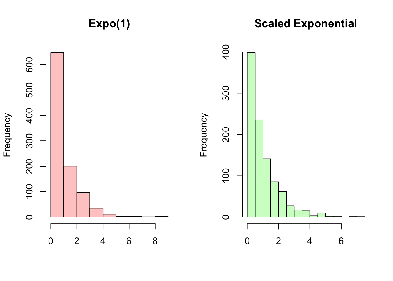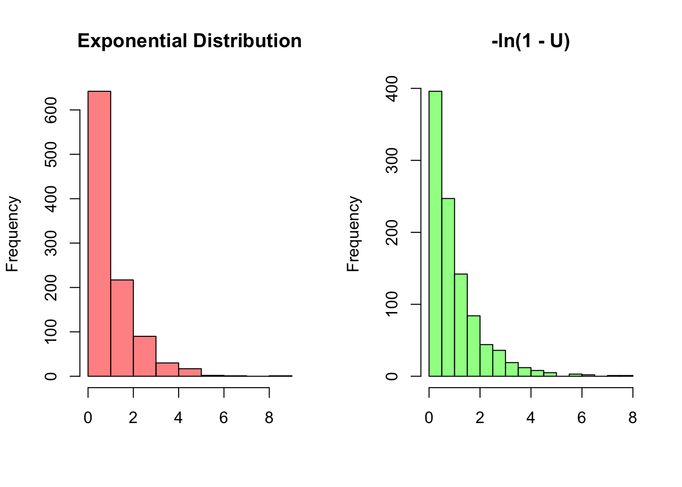From here, Universality says that the LHS of the equation on the right, or \(-ln(1 - U)\), is a random variable with the CDF \(F\). Since CDFs determine distributions, this also means that this new random variable we created, \(-ln(1 - U)\), has the same distribution as the distribution we were trying to mimic. Let’s confirm this result by generating random values in R. We can use the runif command to generate values from the Uniform distribution, and rexp to generate values from the ‘Exponential’ distribution (which, again, we will discuss more fully later on). Magically, these appear to have the same distribution!