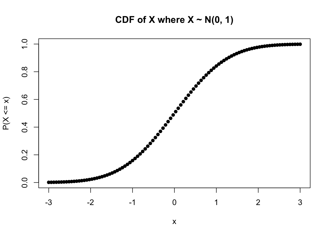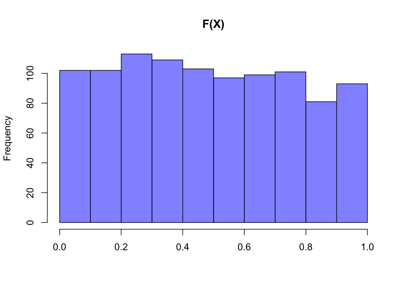 How could this be the case? Well, we know that the CDF \(F\) is just another way to write \(P(X \leq x)\). We also know that we let \(X\) equal \(F^{-1}(U)\), so we can plug this in to \(P(X \leq x)\) to get \(P(F^{-1}(U) \leq x)\). If we apply \(F\) to both sides (assuming that the CDF is increasing and continuous), then we get \(P(U \leq F(x))\). Since \(U\) is a standard normal and \(F(x)\) is between 0 and 1 (it does return a valid probability, after all), then \(P(U \leq F(x)) = F(x)\) (think about it: because \(U\) has length 1, \(P(U \leq c) = c\) for any \(c\) between 0 and 1).