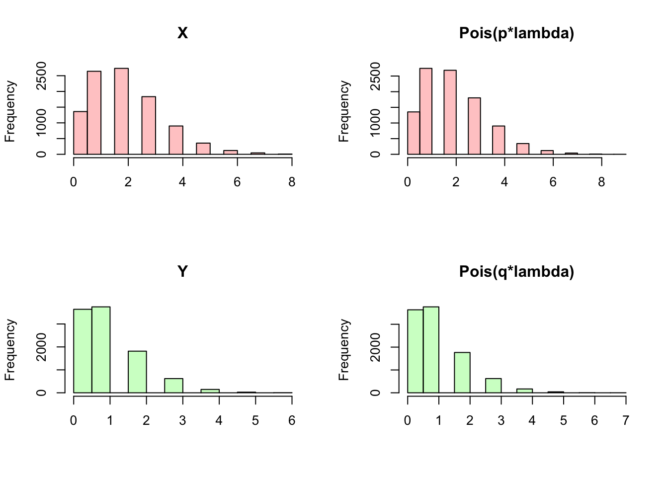 hist(rpois(sims, (1 - p)*lambda), main = "Pois(q*lambda)", col = rgb(0, 1, 0, 1/4), xlab = "")