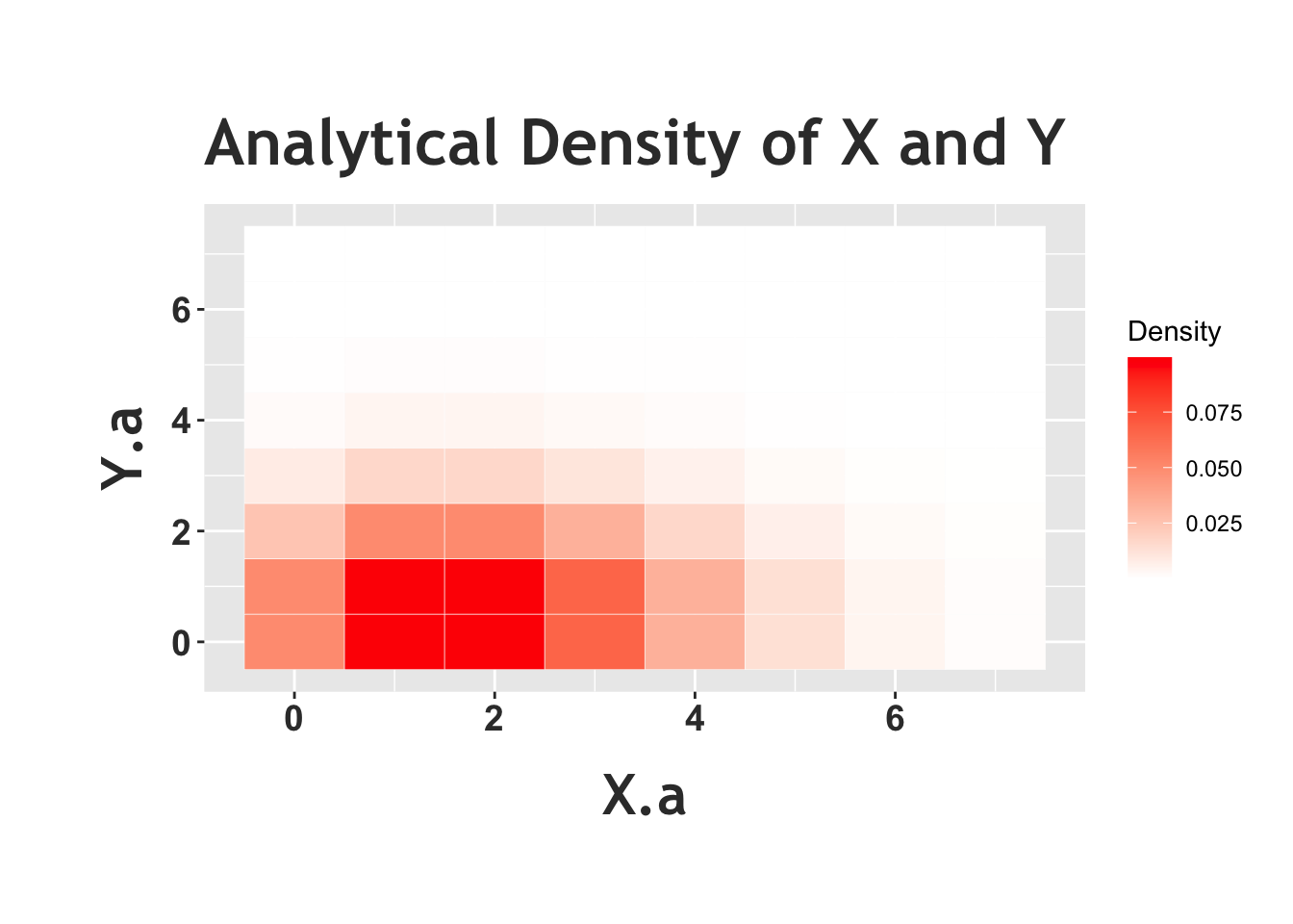 Above we see the empirical heat map of \(X\) and \(Y\) from the Chicken-Egg problem, and we can compare this to the analytical heat map of two independent Poisson random variables below. We see that this heat map looks similar to the one above. The periphery is more filled out in the analytical case; we simply don’t observe these low-probability edges when we run a simulation, but we can plot the probabilities analytically. We can also see here, again, that the relative distributions of the rows (when we condition on specific values of \(Y\)) is similar across rows, again supporting that conditioning on \(Y\) doesn’t change the distribution of \(X\). You could do this same exercise and consider the columns; fix a value of \(X\) and look at the distribution of \(Y\). The implication (which we proved above) is that the random variables are independent.