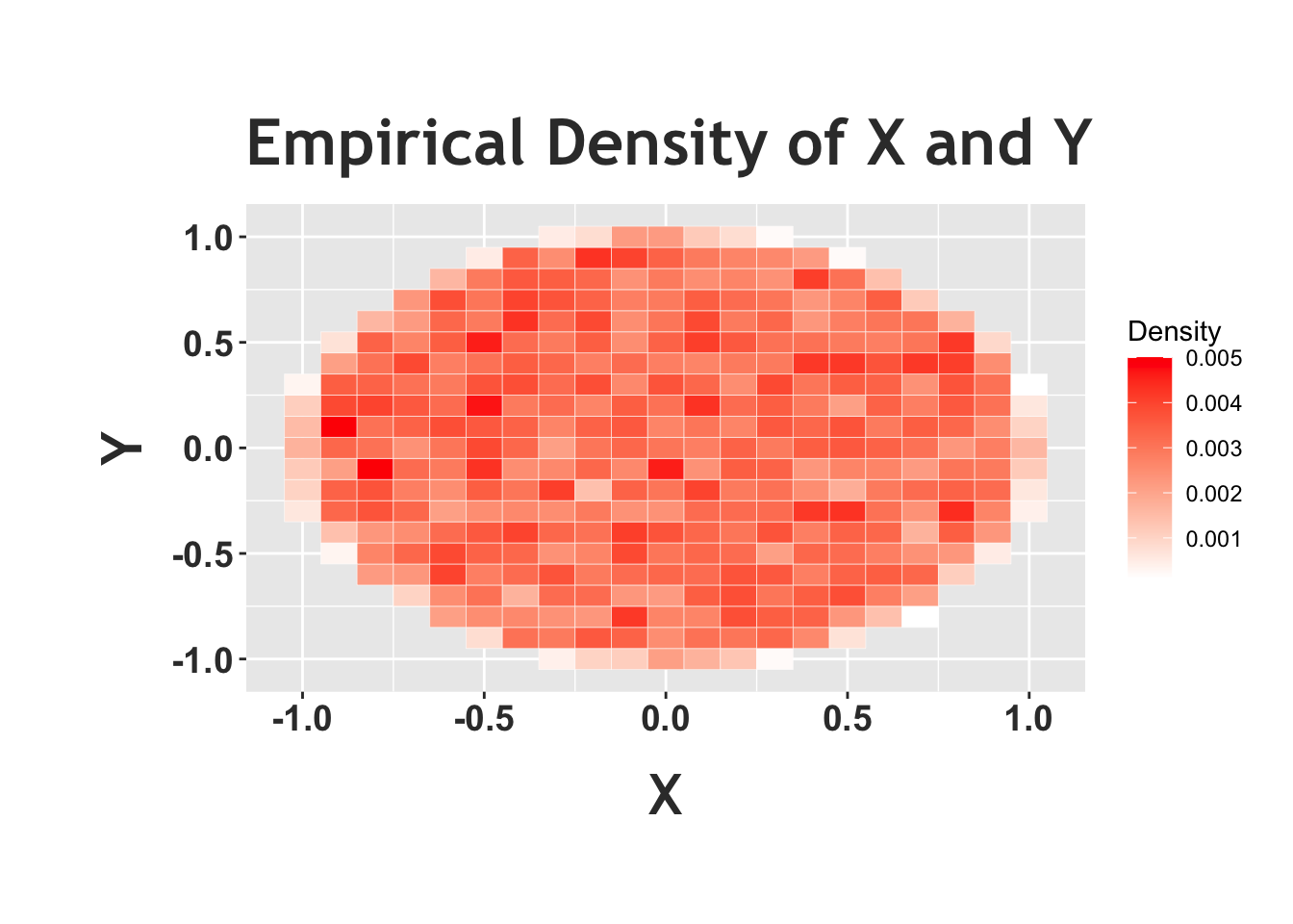 We can confirm this intuition with some simulation and plots in R. First, we’ll generate random variables \(X\) and \(Y\) according to this ‘story’: picking a random point in a circle. How can we generate \(X\) and \(Y\) in this way? We simply sample \(X\) and \(Y\) as independent \(Unif(0, 1)\) random variables and, if they fall outside of the circle (that is, \(X\) crystallizes to \(x\) and \(Y\) to \(y\) and then \(x^2 + y^2 > 1\)), we ‘reject’ the sample. We only accept the sample when the points land inside the circle (call this ‘acceptance sampling’). We can generate the random variables according to this scheme and then plot the ‘heat map.’ We will frequently use heat maps to represent joint distributions: imagine the ‘heat’ (which we depict with darker and darker shades of red) as density. The darker parts of the graph are areas that the random variables are more likely to crystallize to (remember, for a joint distribution, we are concerned with the value that \(X\) takes on and the value that \(Y\) takes on).