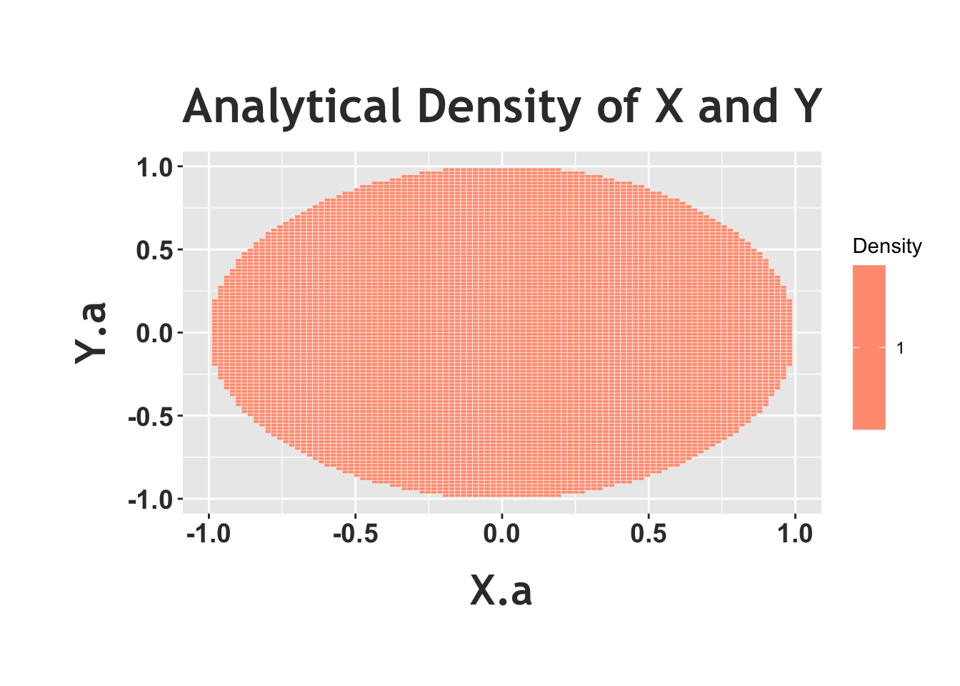 Notice how the above heat map, the empirical density, shows a circle with (relatively) the same color in the entire circle (of course, there appears to be some ‘noise,’ and small areas that are colored in differently, but that’s because this is a random simulation). This matches the ‘story’ we were trying to achieve; we want to randomly pick a point in the unit circle, and ‘random’ means that there should be the same density in every part of the circle, which means that the color of the heat map should be the same in all parts of the circle. To really see this in effect, we can plot the ‘analytical’ joint density with a heat map below. Recall that the joint PDF is just 1, so we should see the same color in the entire circle.