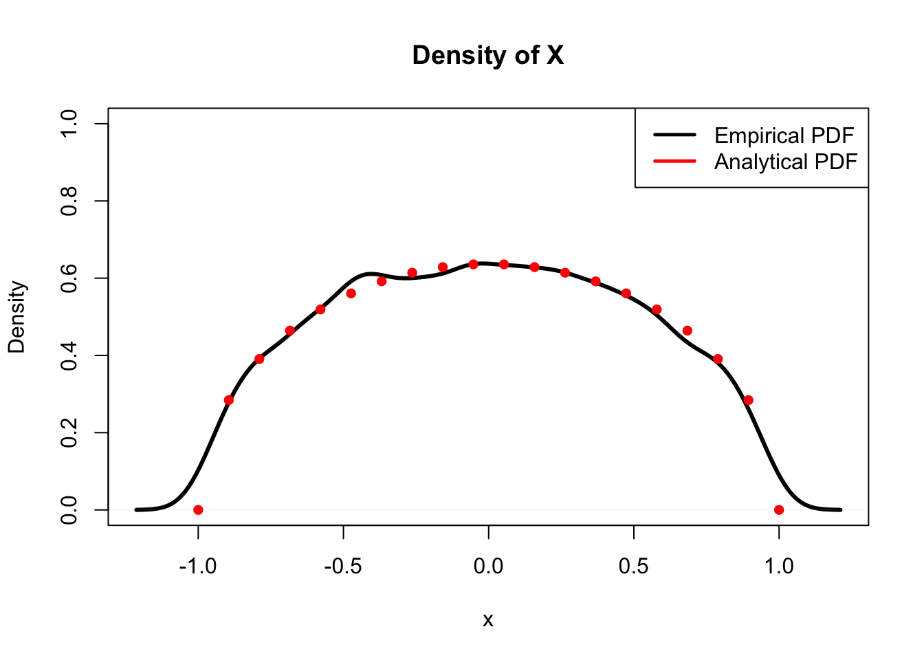 legend("topright", legend = c("Empirical PDF", "Analytical PDF"),