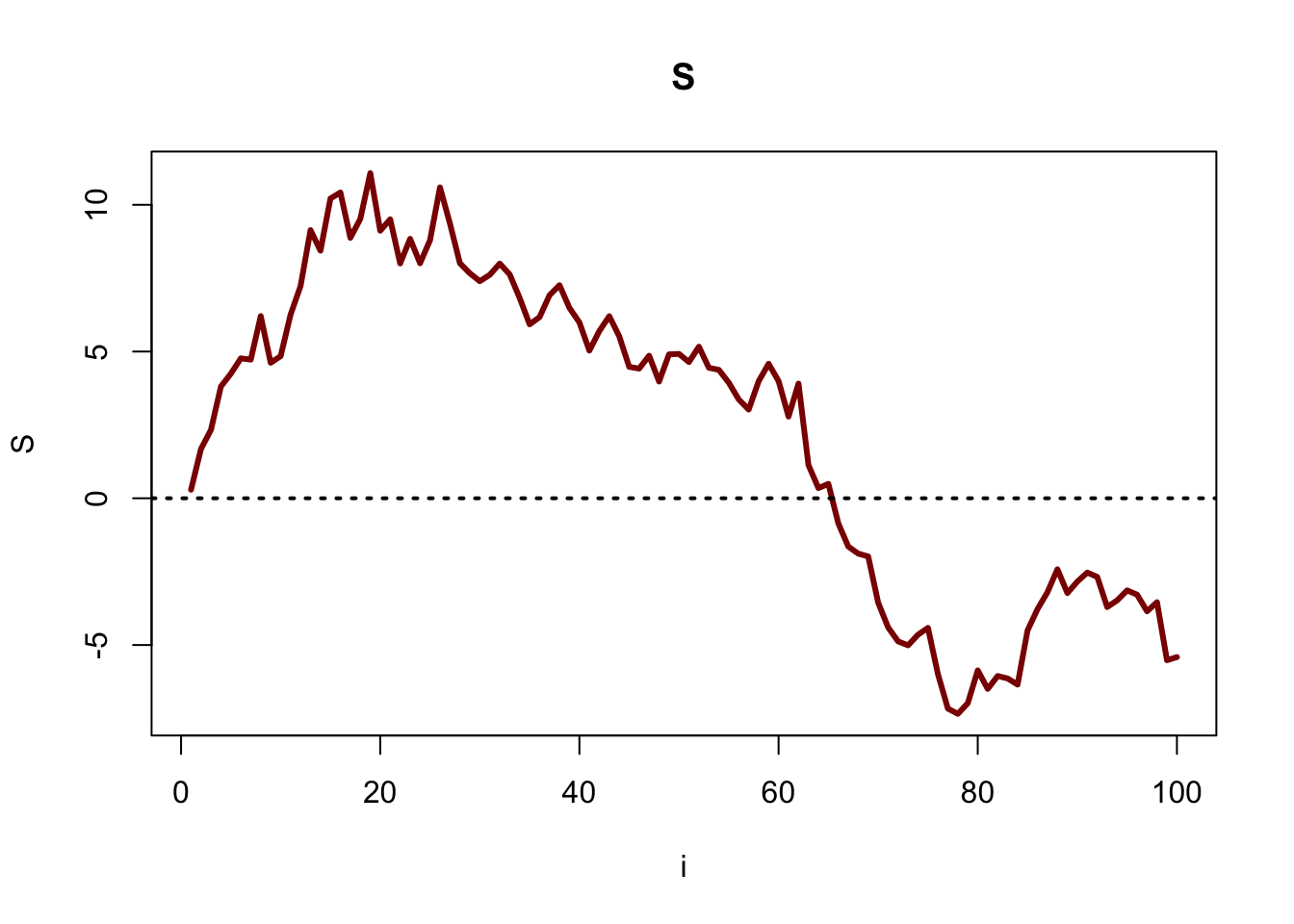Let’s consider a slightly more advanced example of a for loop in a more sophisticated setting (for more background, see Chapter 4 and Chapter 10). As we will see, a stochastic process is a random variable that changes through time. Let \(S\) be a stochastic process, so that \(S_i\) is the value of \(S\) at time \(i\), and define \(S_0 = 0\) (so we start at 0). In general, define: