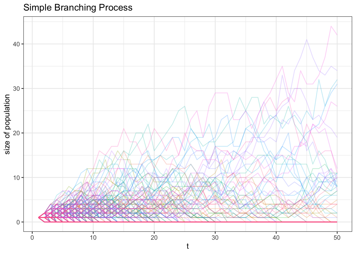 Note that branching process are Markov; if we know how many cells are alive at time \(t - 1\) (which is \(X_{t - 1}\)), then no extra information from the history of the process matters in determining the distribution of \(X_t\). This is intuitive; we only care how many cells are alive in the period before (and thus how many will create reproductions), we don’t care how we got to that point!