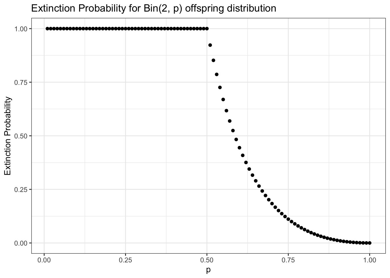 We see in the above chart an interesting pattern; the probability of extinction for \(p\leq .5\) is simply 1 (i.e., the population will definitely go extinct). In fact, there is a simple, useful way to tell if a branching process will go extinct or might go extinct; we explore that here (with help from this resource).