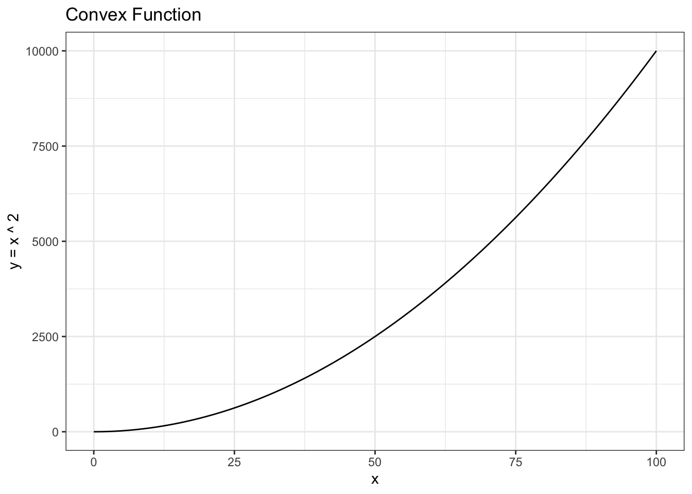 xlab("x") + ylab("y = x ^ 2") + ggtitle("Convex Function")