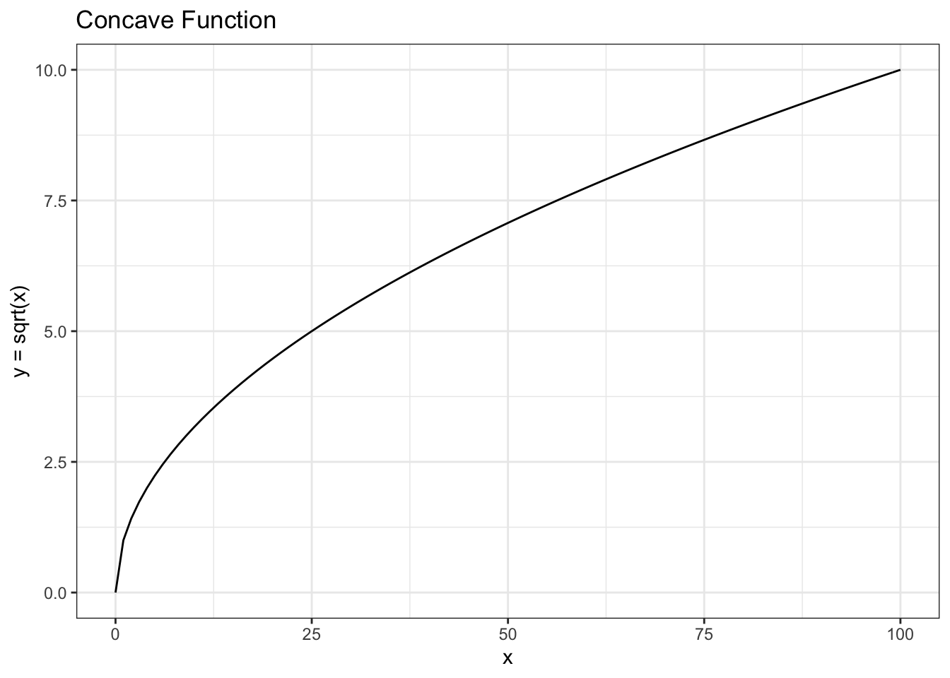 xlab("x") + ylab("y = sqrt(x)") + ggtitle("Concave Function")