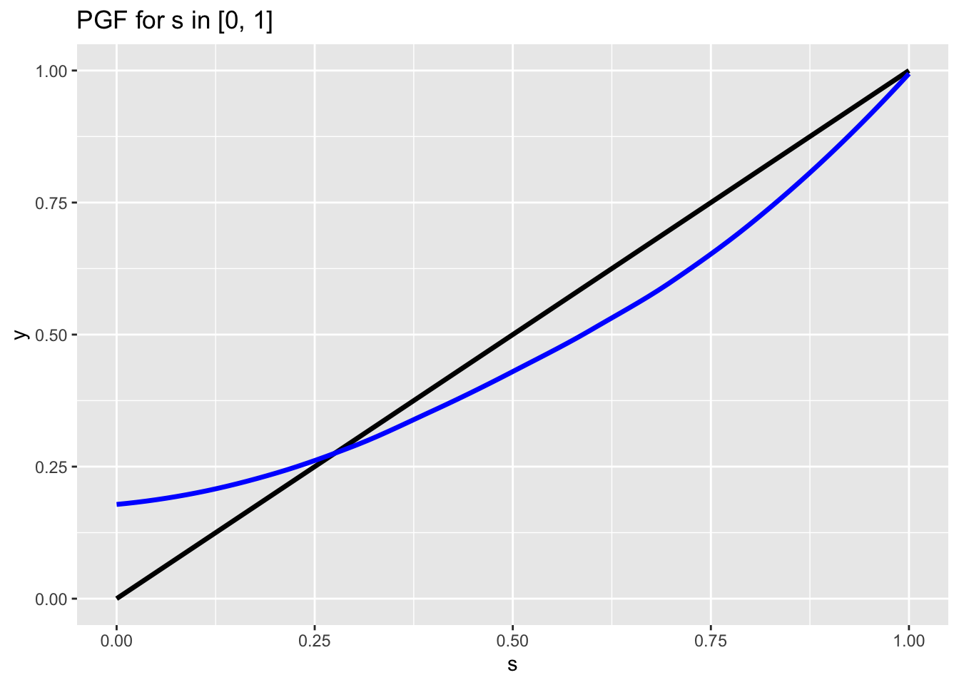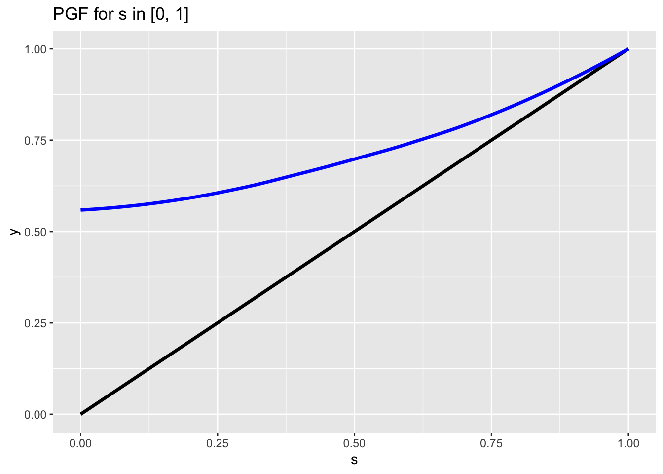 Note that, because \(E(X_0) < 1\), the blue line stays entirely above the black line until \(s = 1\). This is obviously the case in the above chart, but it’s also the case whenever \(E(X_0) < 1\). The reason is because, since the slope is less than 1, as we move backward from \(s = 1\) the blue line will not fall as quickly as the black line and thus the black line will be under the blue line. As we move closer to \(s = 0\), the slope will get even smaller (because we showed that the PGF is a convex function from \(s = 0\) to \(s = 1\) and thus the slope increases on this interval) and the blue line will never catch the black line before \(s = 0\).