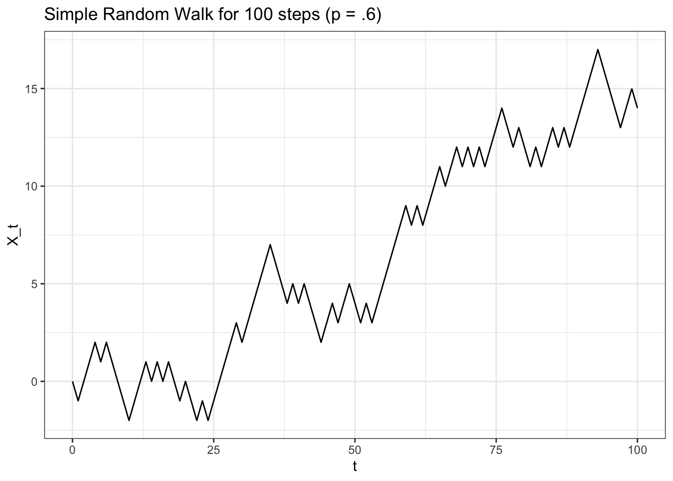 Where \(X_0 = 0\). We let the \(Y\) random variables be i.i.d. such that \(P(Y_i = 1) = p\) and \(P(Y_i = -1) = 1 - p = q\) (that is, \(Y\) can only equal \(1\) with probability \(p\) or \(-1\) with probability \(q = 1 - p\)). We can envision, then, \(X_t\) simply moving up or down \(1\) at each time point, governed by the probability \(p\) (of moving up \(1\); remember that \(q\), or \(1 - p\), is the probability of moving down \(1\)). Let’s simulate a simple random walk to visualize its activity: