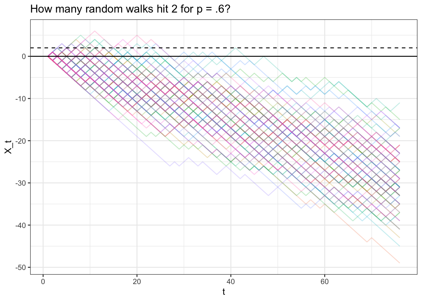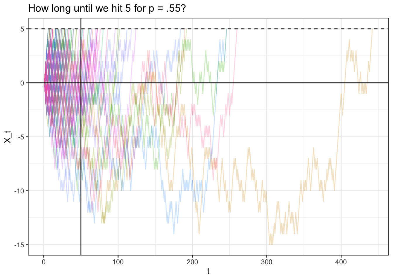 Here we vary \(j\) along the x-axis and \(p\) along the y-axis, and report the win probability of \(A\) with the size of the bubble (we also overlay text that reports the win probability with geom_text). It’s important to note here that \(p\) drives the win probability of \(A\) more than \(j\). We can see this visually: the dots change more when we move up and down than they do when we move left and right. Further, the edge cases are telling: when \(A\) only starts with \(j = 1\) dollars but has \(p = .9\) probability of winning each round, \(A\) has a \(.89\) probability of winning the entire game (the visual intuition here is that \(A\) has a \(.9\) probability of winning the game and going to \(j = 2, \; p = .9\) on the graph, which has a \(.99\) win probability). That is, even though \(A\) is starting with 1 dollar and \(B\) is starting with the rest (9 dollars), \(A\) is still the overwhelming favorite. Symmetrically, of course, this means that if \(A\) starts with 9 dollars but has \(p = .1\), he only has a \(.11\) probability of winning the game.