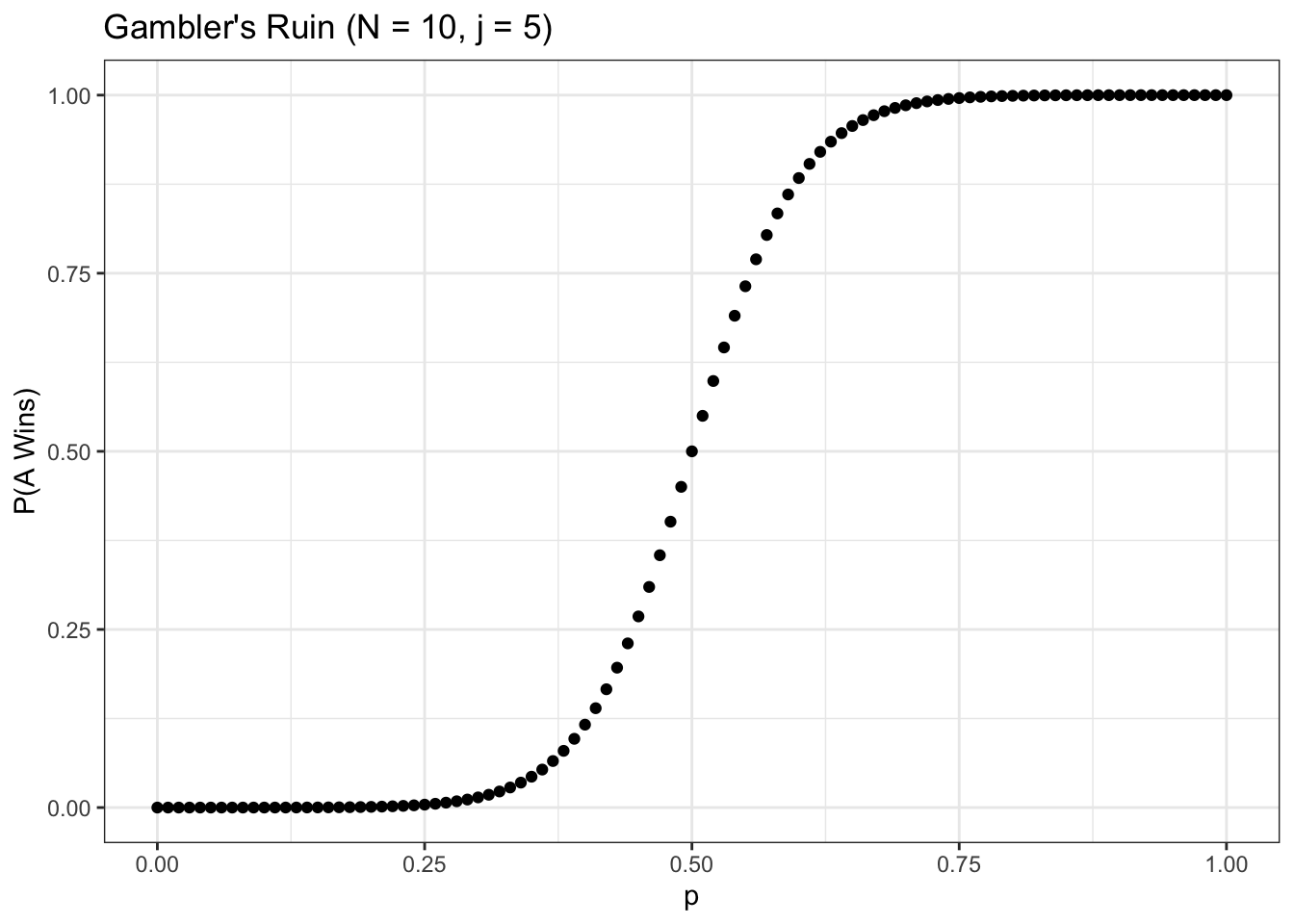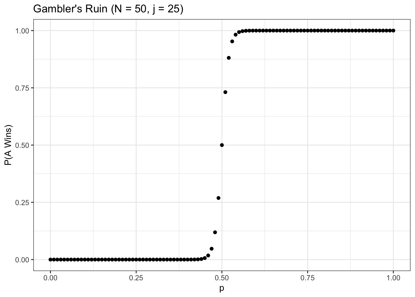 Unsurprisingly, as we increase \(p\), the probability that \(A\) wins rises rapidly (it gets very close to \(1\) for \(p \geq .75\), and symmetrically very close to \(0\) for \(p \leq .25\)). As we increase \(N\) (keeping \(j\) at \(N/2\)) the function gets even steeper:
