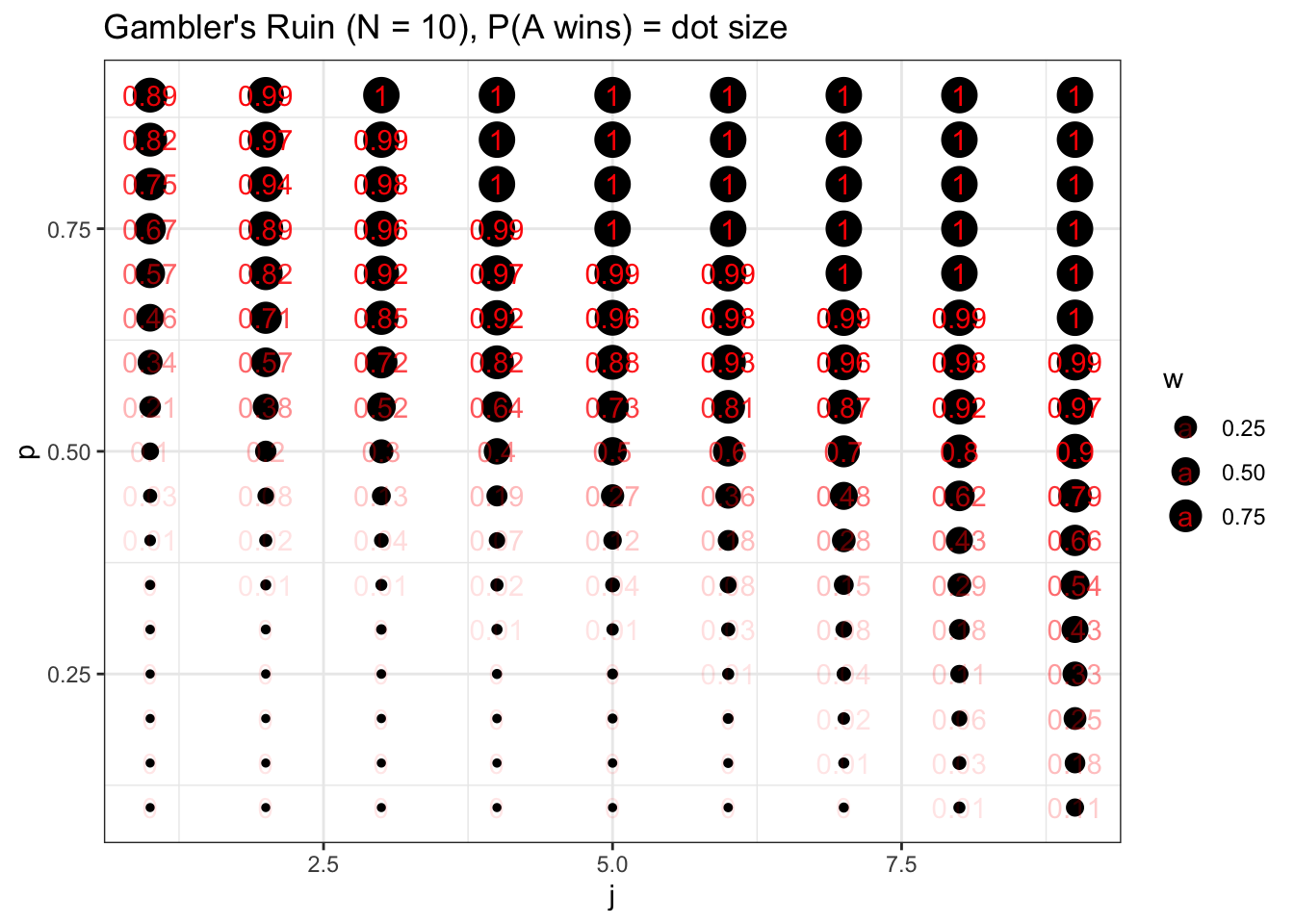 ggtitle("Gambler's Ruin (N = 10), P(A wins) = dot size") +