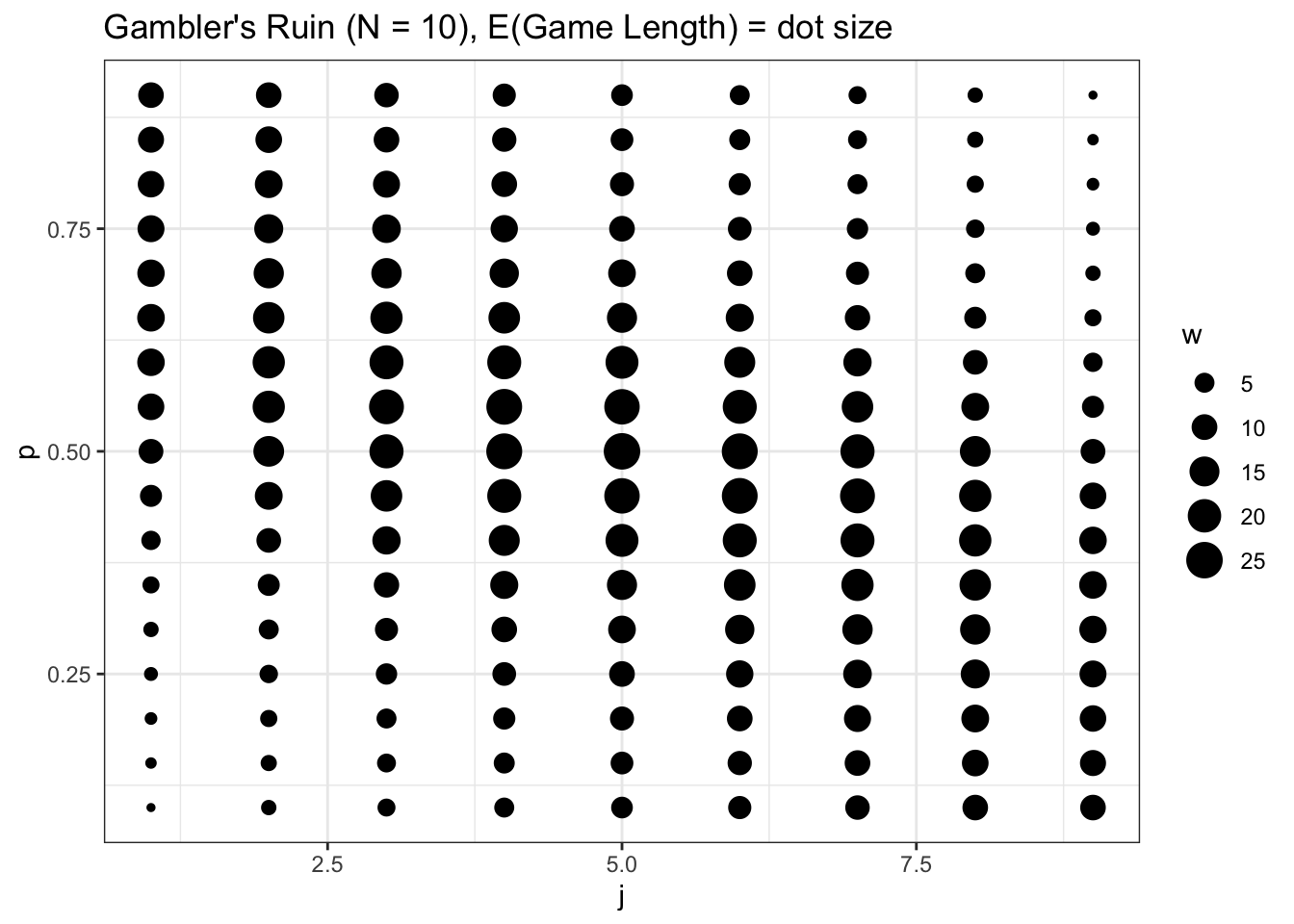 ggtitle("Gambler's Ruin (N = 10), E(Game Length) = dot size") +