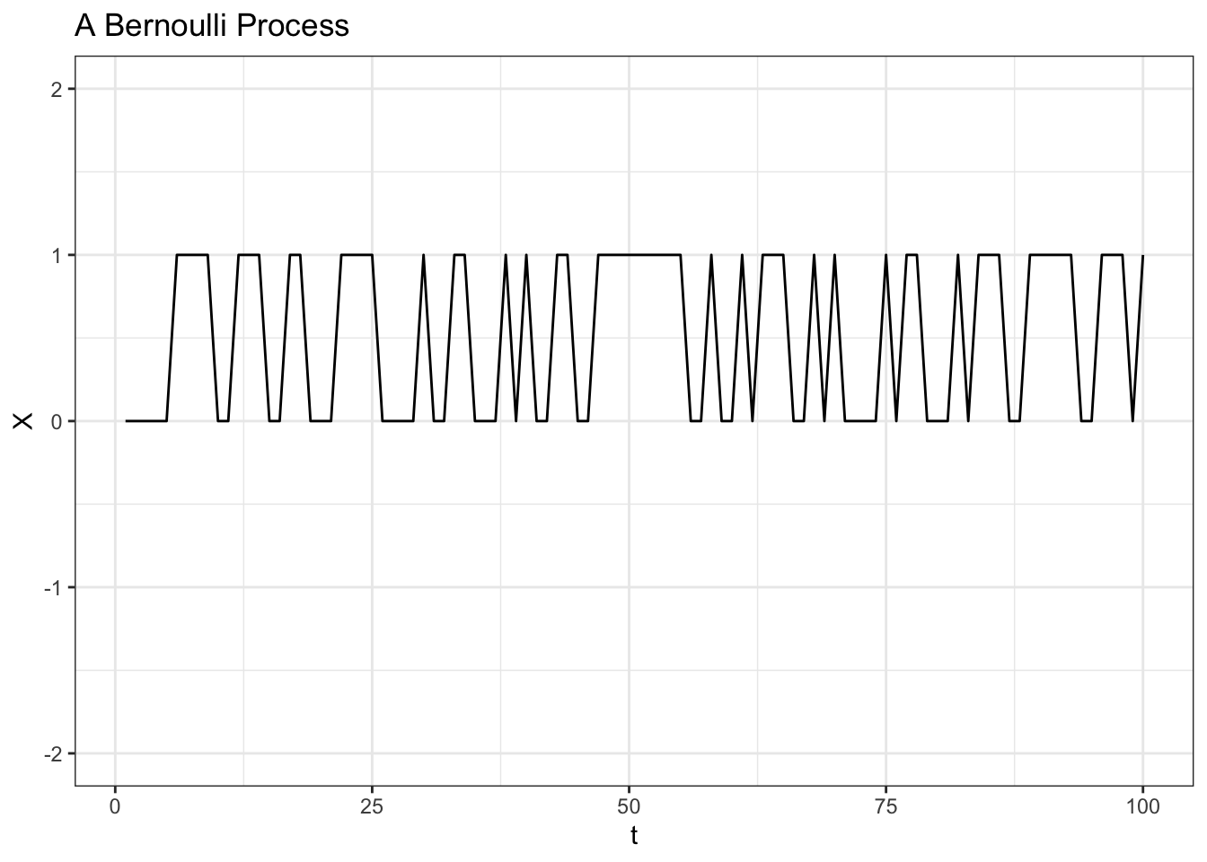 Since we know that a Bernoulli is essentially a coin flip that takes on the value 1 with probability \(p\) and takes on the value 0 with probability \(1-p\), this stochastic process is just a series of zeroes and ones. For our starting stochastic process, let’s have \(p = 1/2\).