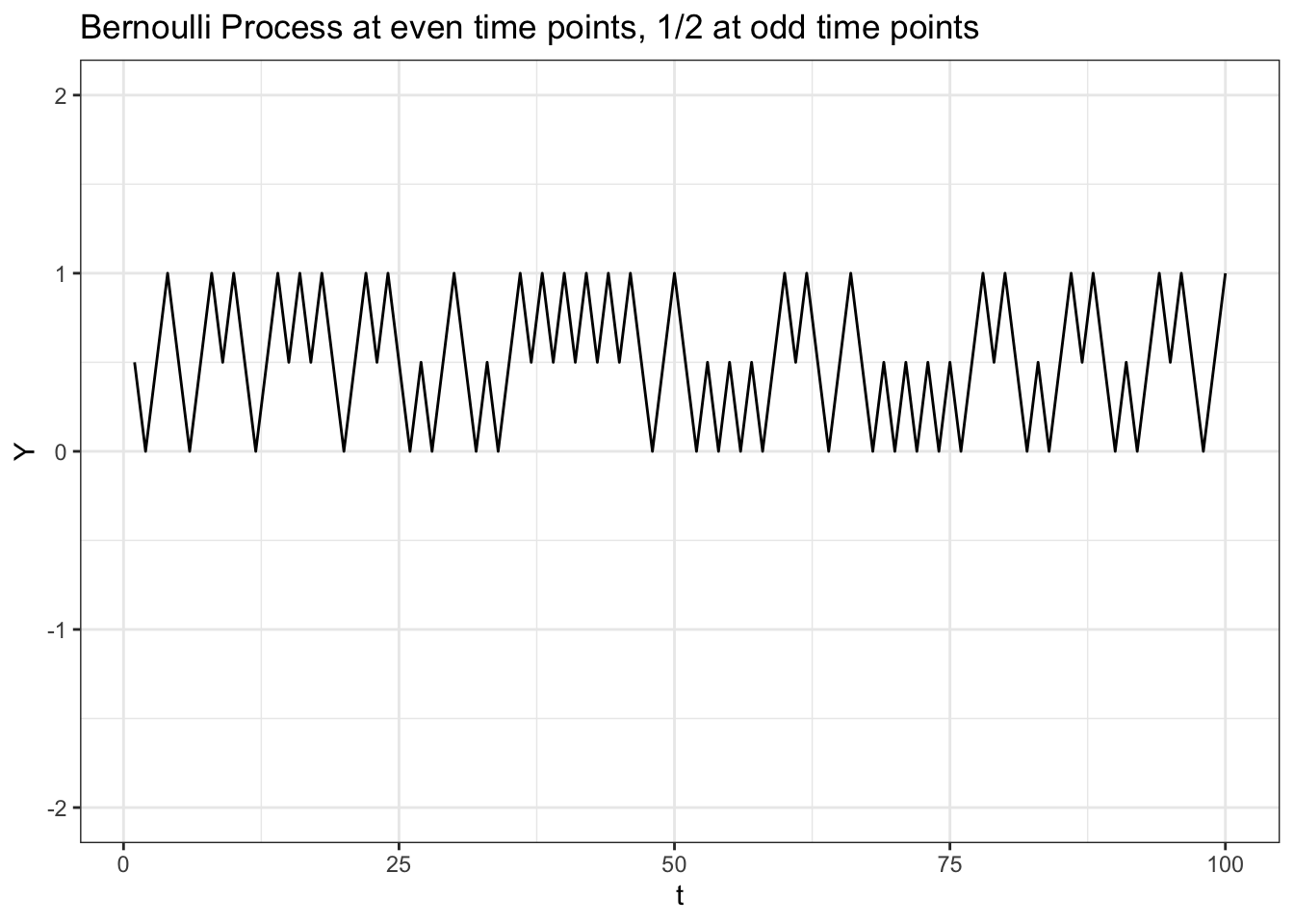 Let’s define a new stochastic process \(Y_t\) that takes on \(X_t\) when \(t\) is even and simply takes on the constant \(1/2\) when \(t\) is odd. We can simulate this easily in R (using the ‘modulo’ function \(%%\) which gives us the remainder of one number divided into another number):