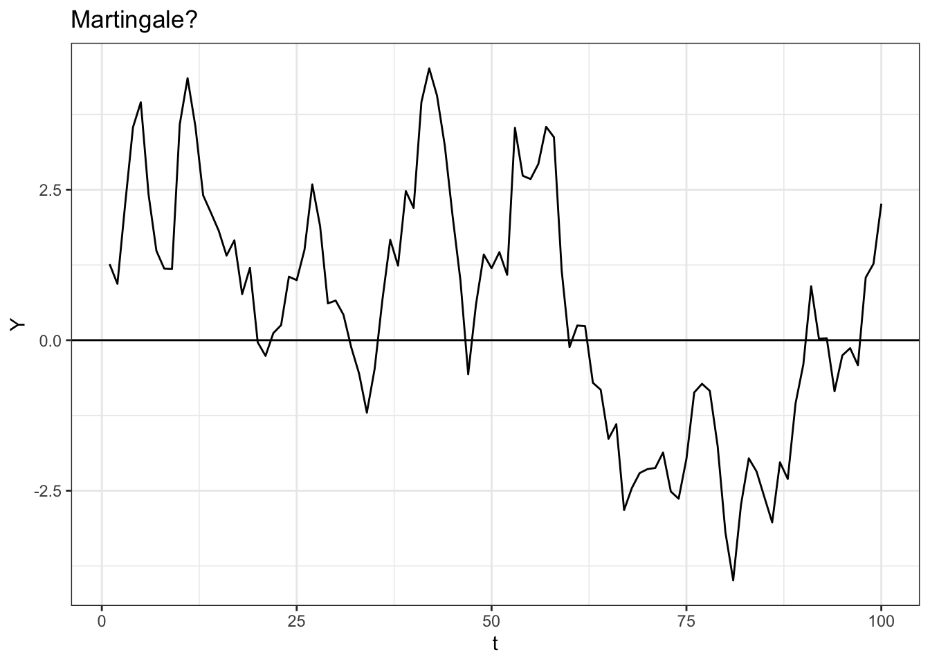 Therefore, \(Y_t\) is a martingale, because the expected value of the next step is the step that we are currently at (conditioning on the history of \(Y_t\) up to the current moment). Intuitively, this is because at each step we add something (\(\epsilon_t\)) with a mean of zero, so the expected value of the next time point in the series doesn’t move from where we are now (we are adding zero)!