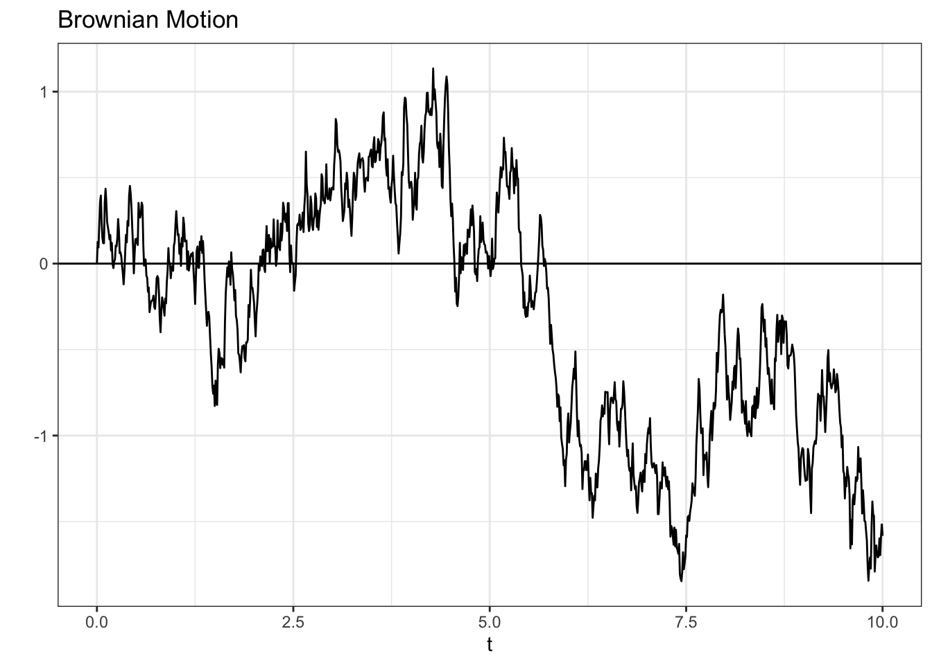 To explore this property, we will introduce a new stochastic process: Brownian Motion. This is a stochastic process with a relatively simple structure but many applications. Let \(X_t\) be Brownian Motion; we have that \(X_0 = 0\) and:
