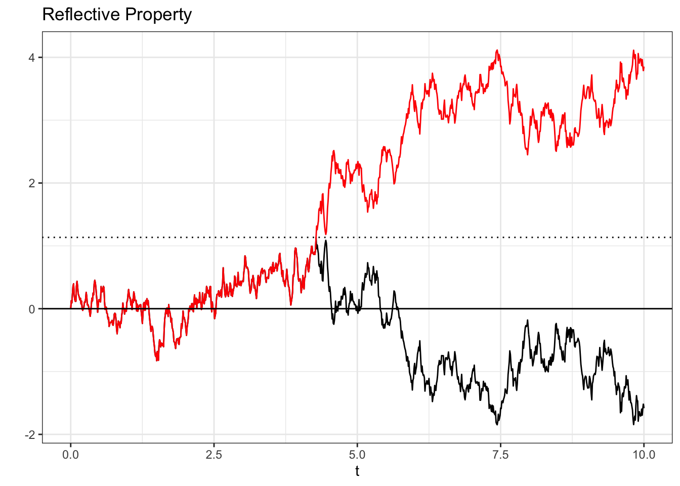 Now, the reflection principle states that the black line has the same probability of being realized as the red line. That is, at time \(t = 0\), these two paths have the same probability of occurring. For a proof here, we can rely on symmetry: since the increment at every time step is symmetric about zero and we are simply flipping all of the increments after a certain point to get from the black line to the red line, the two paths should have the same probability (remember, for a symmetric random variable \(Z\), we have that \(Z\) has the same distribution as \(-Z\)).