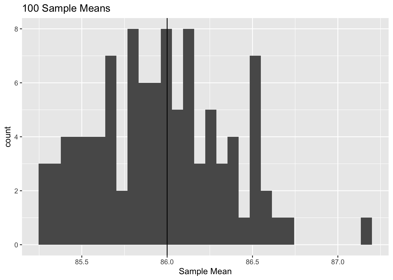 We can investigate this with our R code above; the mean of the sample means should be close to the true mean of 86, and, indeed, it is!