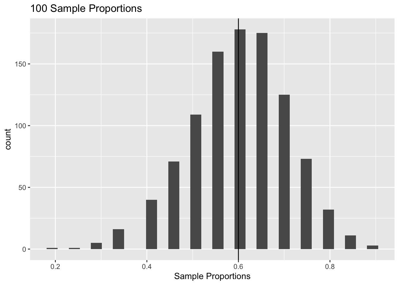 ggtitle("100 Sample Proportions")## `stat_bin()` using `bins = 30`. Pick better value with `binwidth`.
