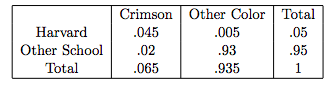 So, extending this concept, we can find the rest of the marginals: \(P(Other \; School) = .95\), \(P(Crimson) = .065\), and \(P(Other \; Color = .935)\).