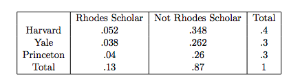 First (and we’ve already touched upon this) how do the marginal, conditional and joint probabilities show up here? We know that college is conditionally distributed on Rhodes Scholar status, but know little in terms of probabilities.