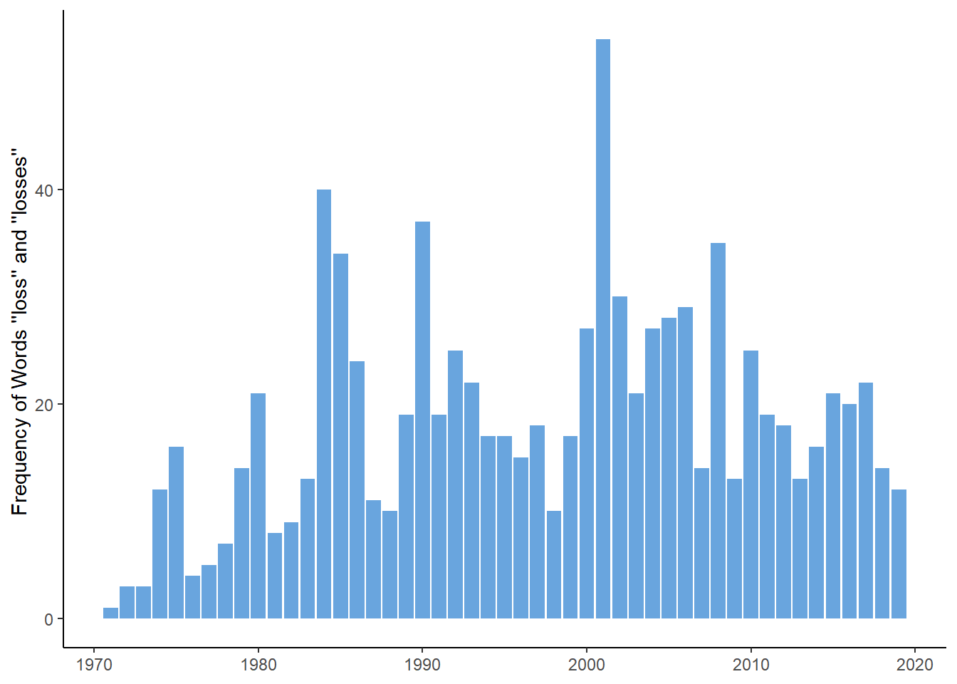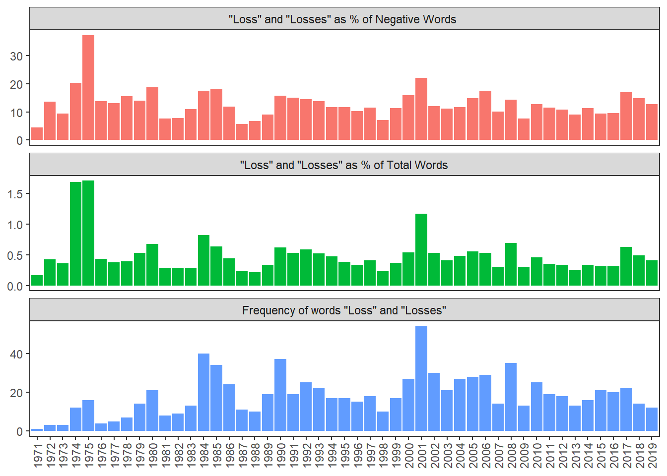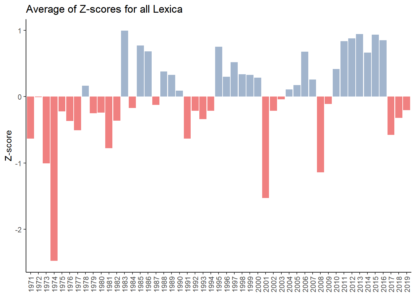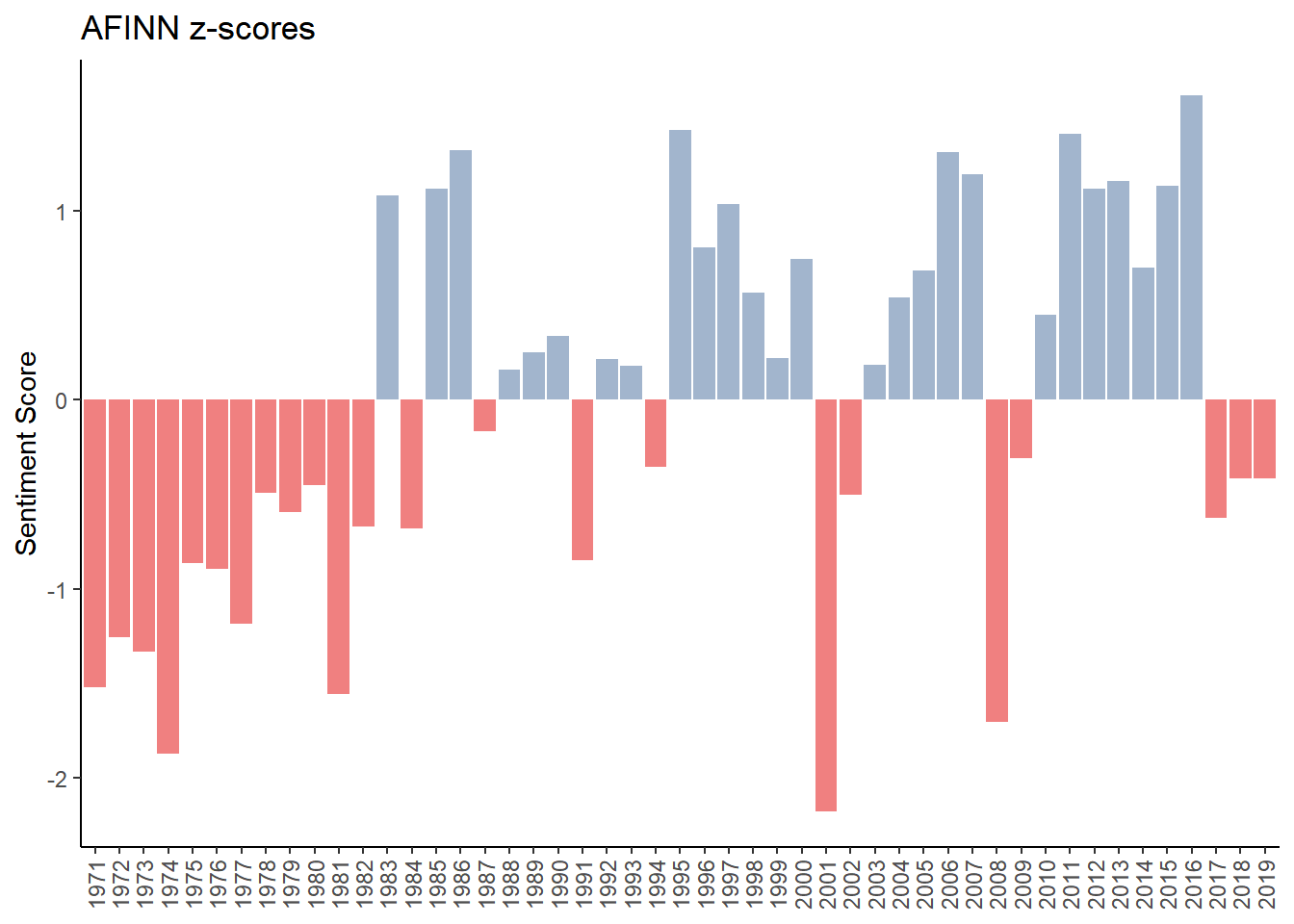 Not all dictionaries calculate sentiment in this way (positive - negative / total). Another method is using a finer level of “resolution” and assign words on a continuous scale with more extreme words having higher values. So “catastrophic” might have a score of -0.90 while “bad” might have a score of -0.30. With this type of scoring, all the words in a particular letter are summed up to get an overall sentiment score for that year.