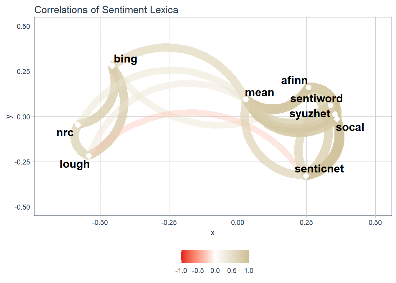 Figure 4.9 shows just the “binary” lexica (Bing, Loughran and NRC). We can see these are highly correlated.