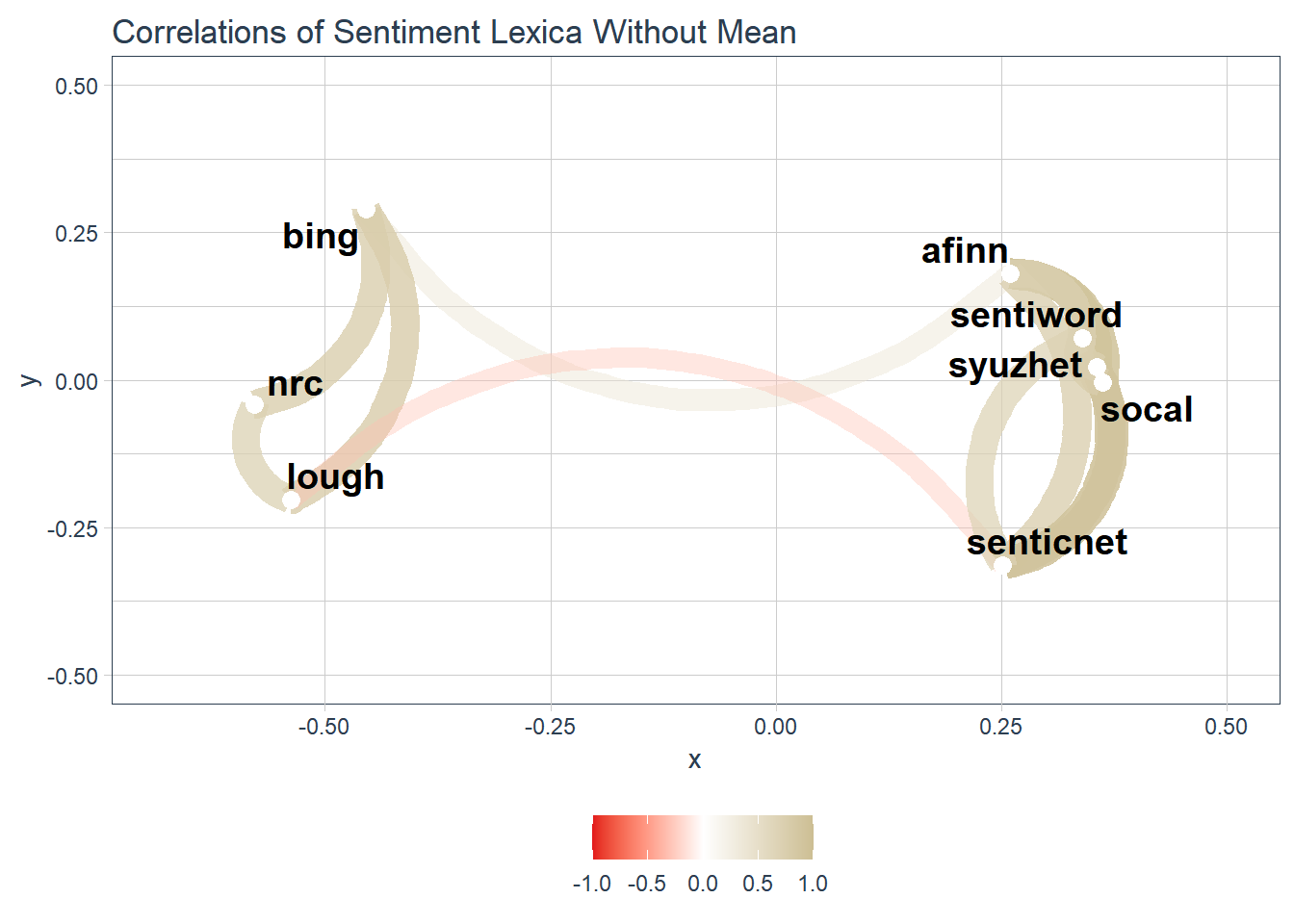 labs(title = "Correlations of Sentiment Lexica Without Mean") +