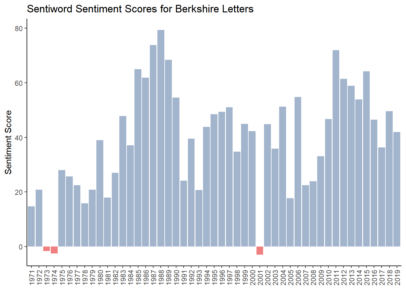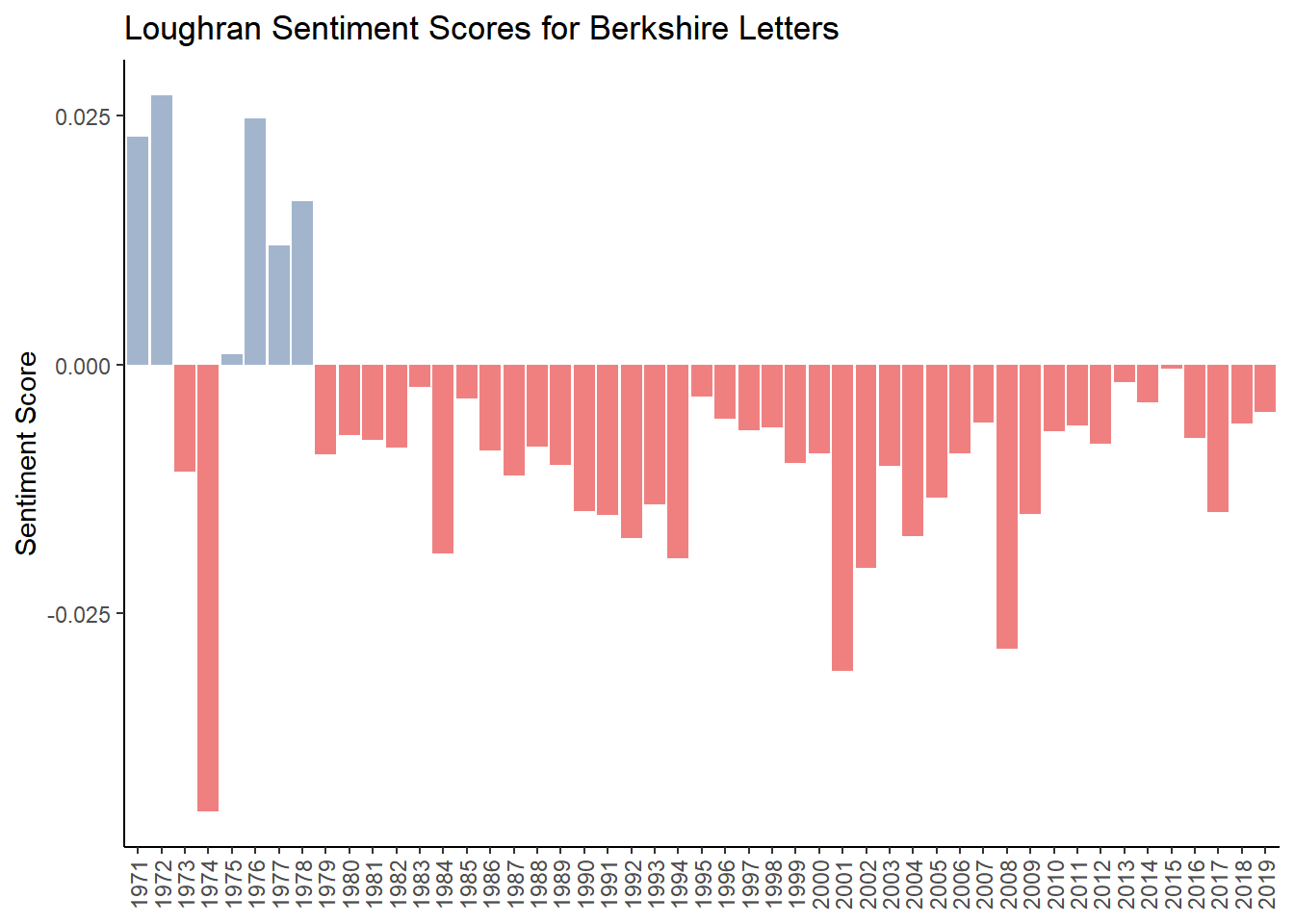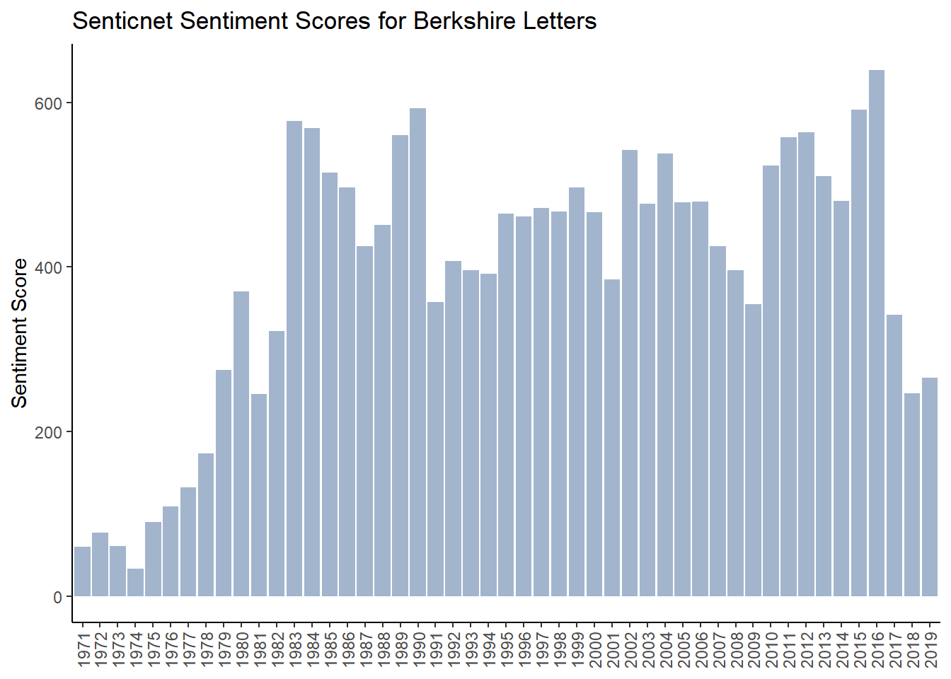I want to set expectations before moving further. It would be great if we could use changes in the sentiment of Warren Buffett’s letters to predict movement in Berkshire’s stock to make millions of dollars. I can say with full confidence that this won’t happen. Sentiment will likely be a coincident indicator at best. What the sentiment score will represent is an “educated guess” of Buffett’s attitude, gleaned from his letters, concerning a mix of the performance over the past year and the outlook going forward. Given that the market is extremely efficient, any positive or negative performance over the past year as well as expectations for future performance will already be incorporated into Berkshire’s stock price. Therefore it is unlikely that the sentiment of Berkshire’s letters will influence it’s stock price. In fact, one could do a simple event study to see if Berkshire’s stock price has a meaningful change in the trading days after the letter is released. But since fourth quarter earnings are release simultaneously with the letter it would be difficult to disentangle the sentiment of the letter from the performance of the business (the latter of which should already be incorporated into the stock price anyway). Bottom line: my expectations are low and so should yours.