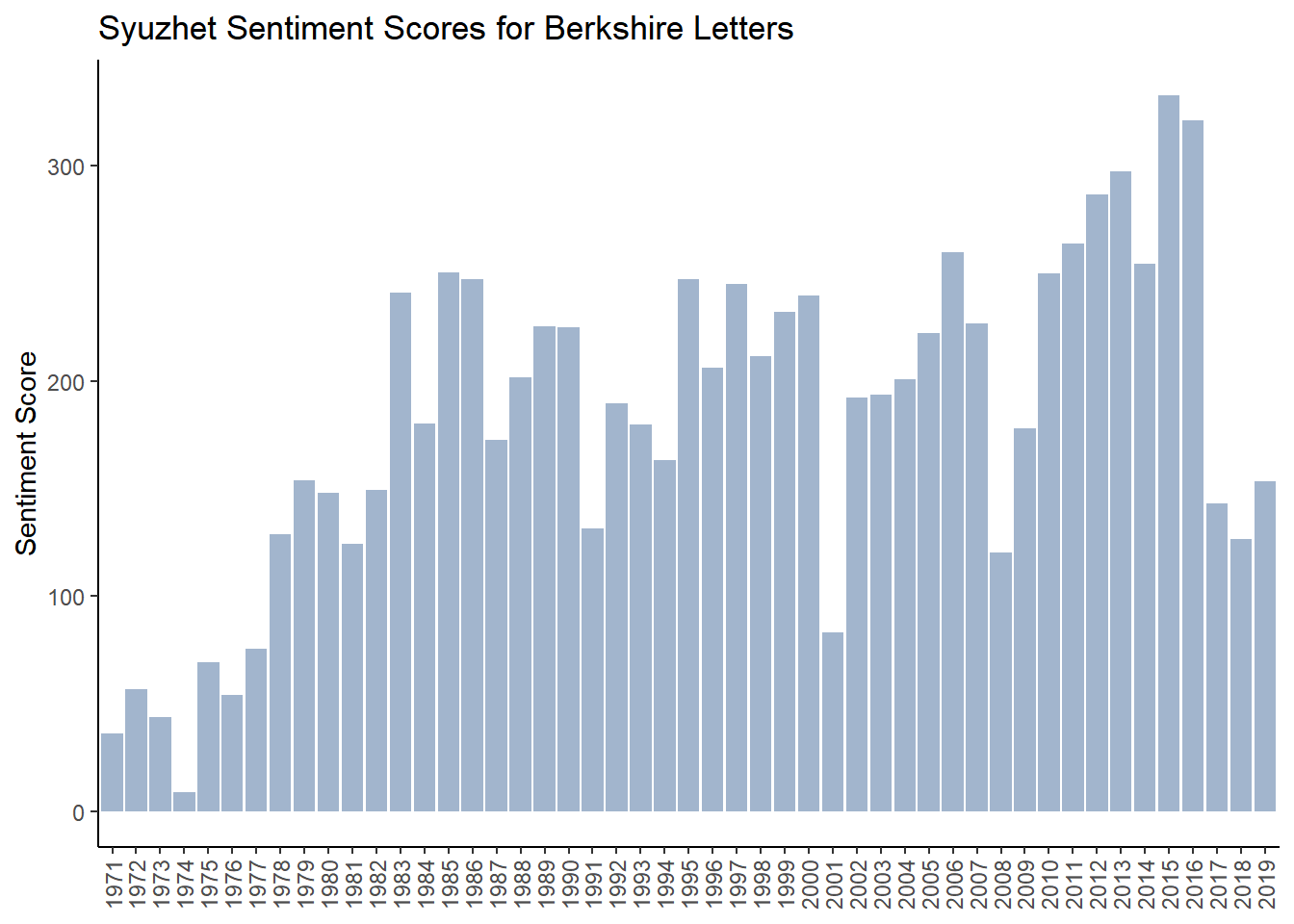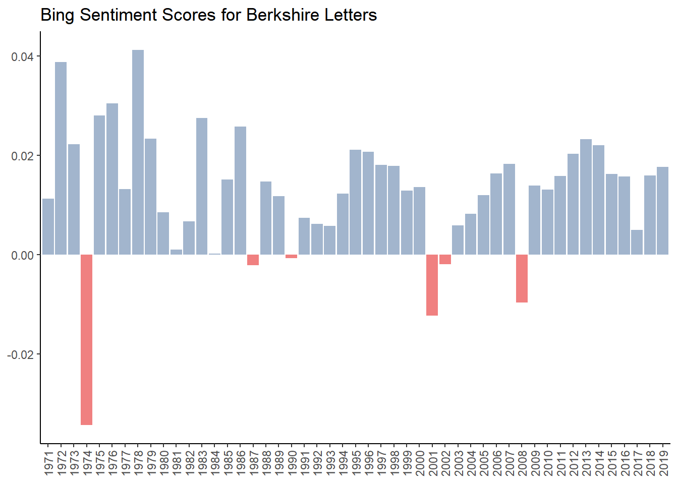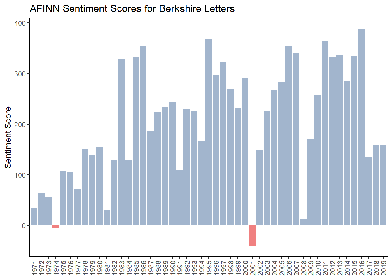 I want to set expectations before moving further. It would be great if we could use changes in the sentiment of Warren Buffett’s letters to predict movement in Berkshire’s stock to make millions of dollars. I can say with full confidence that this won’t happen. Sentiment will likely be a coincident indicator at best. What the sentiment score will represent is an “educated guess” of Buffett’s attitude, gleaned from his letters, concerning a mix of the performance over the past year and the outlook going forward. Given that the market is extremely efficient, any positive or negative performance over the past year as well as expectations for future performance will already be incorporated into Berkshire’s stock price. Therefore it is unlikely that the sentiment of Berkshire’s letters will influence it’s stock price. In fact, one could do a simple event study to see if Berkshire’s stock price has a meaningful change in the trading days after the letter is released. But since fourth quarter earnings are release simultaneously with the letter it would be difficult to disentangle the sentiment of the letter from the performance of the business (the latter of which should already be incorporated into the stock price anyway). Bottom line: my expectations are low and so should yours.