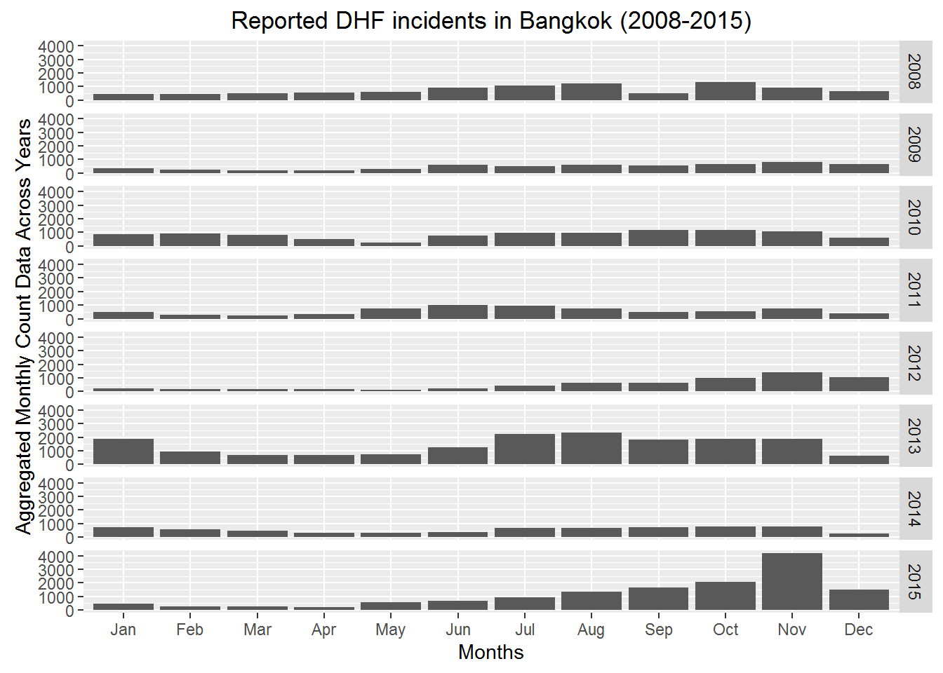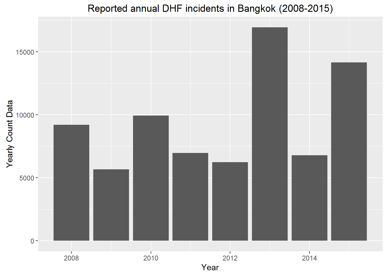 The plot shows the Dengue hemorrhagic fever(DHF) incidence peaked in 2013 and 2015.