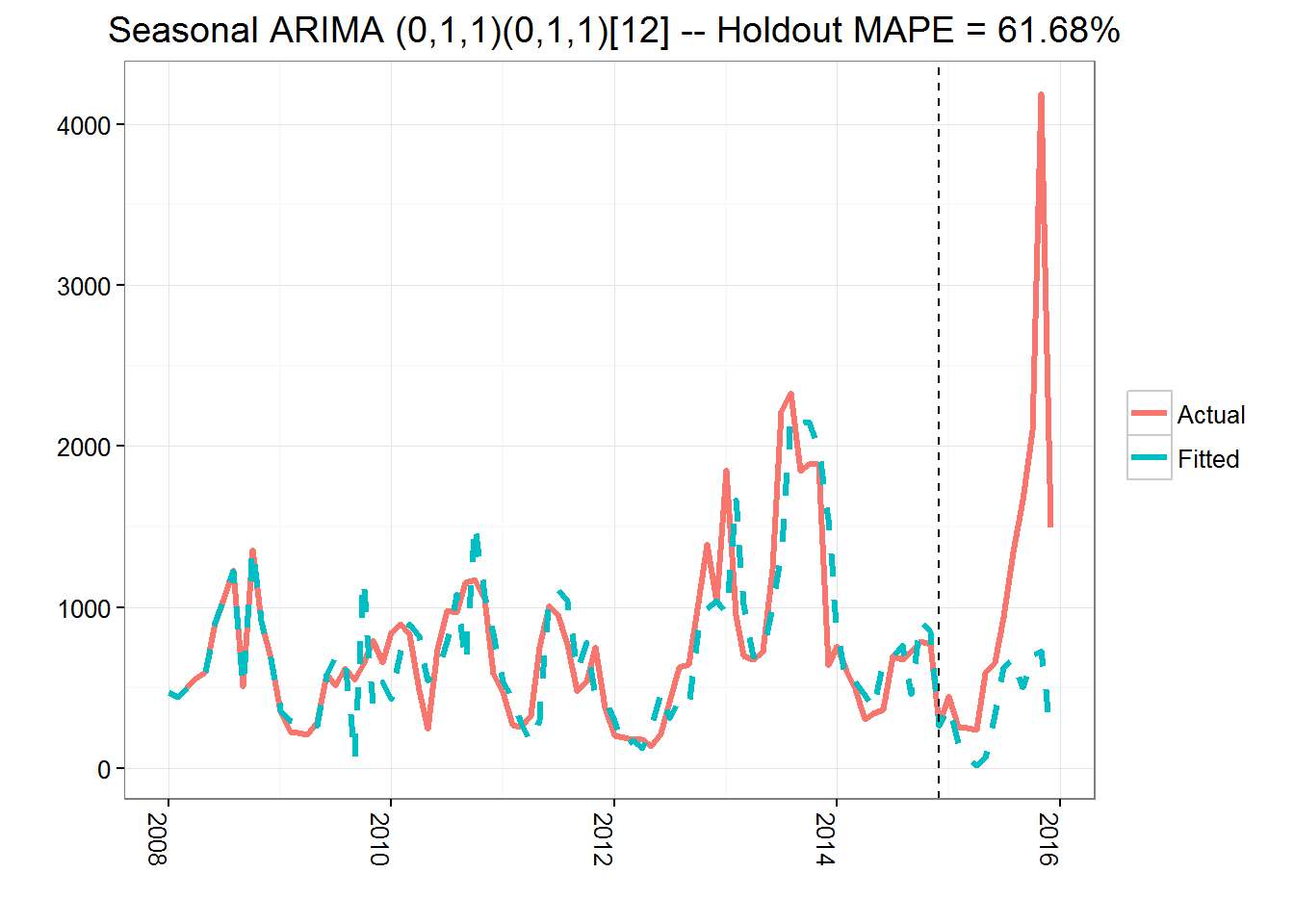 I fit an ARIMA(0,1,1)(0,1,1)[12] model.